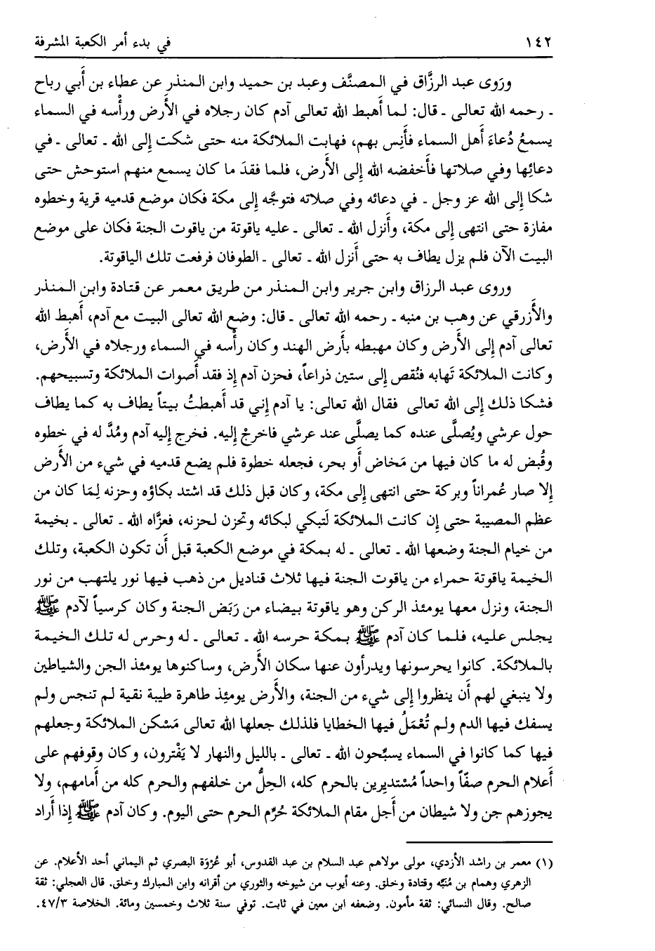 وروى عبد الرزاق وابن جرير وابن المنذر من طريق معمر [ (1) ] عن قتادة وابن المنذر والأزرقي عن وهب بن منبه- رحمه الله تعالى- قال: وضع الله تعالى البيت مع آدم، أهبط الله تعالى آدم إلى الأرض وكان مهبطه بأرض الهند وكان رأسه في السماء ورجلاه في الأرض، وكانت الملائكة تهابه فنقص إلى ستين ذراعاً، فحزن آدم إذ فقد أصوات الملائكة وتسبيحهم.