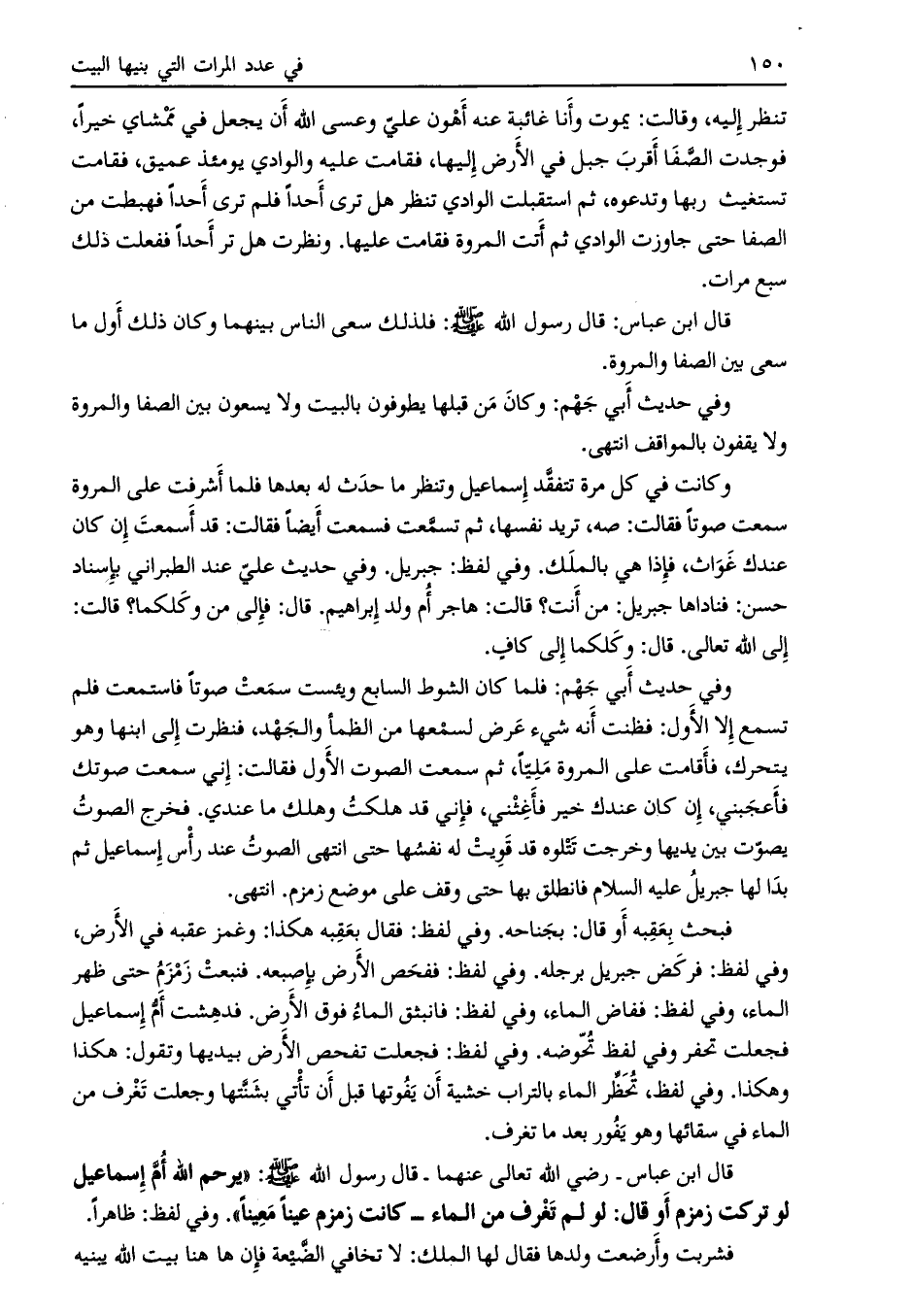 قال ابن عباس- رضي الله تعالى عنهما- قال رسول الله صلى الله عليه وسلّم: «يرحم الله أمّ إسماعيل لو تركت زمزم أو قال: لو لم تغرف من الماء- كانت زمزم عينا معينا» .