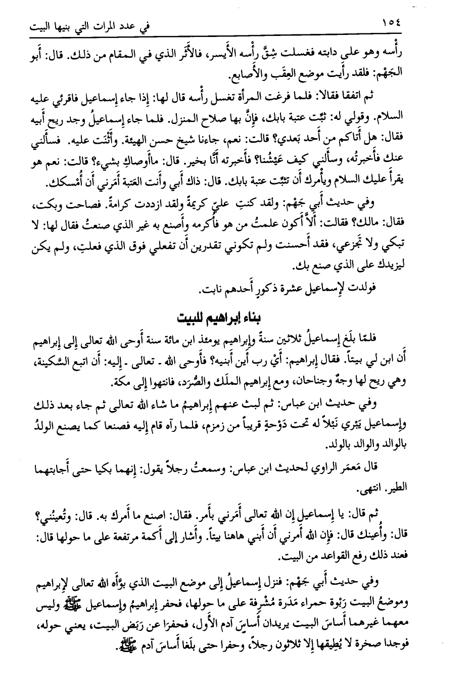 ثم اتفقا فقالا: فلما فرغت المرأة تغسل رأسه قال لها: إذا جاء إسماعيل فاقرئي عليه السلام. وقولي له: ثبّت عتبة بابك، فإنّ بها صلاح المنزل. فلما جاء إسماعيل وجد ريح أبيه فقال: هل أتاكم من أحد بعدي؟ قالت: نعم، جاءنا شيخ حسن الهيئة. وأثنت عليه. فسألني عنك فأخبرته، وسألني كيف عيشنا؟ فأخبرته أنّا بخير. قال: ما أوصاك بشيء؟ قالت: نعم هو يقرأ عليك السلام ويأمرك أن تثبت عتبة بابك. قال: ذاك أبي وأنت العتبة أمرني أن أمسكك.