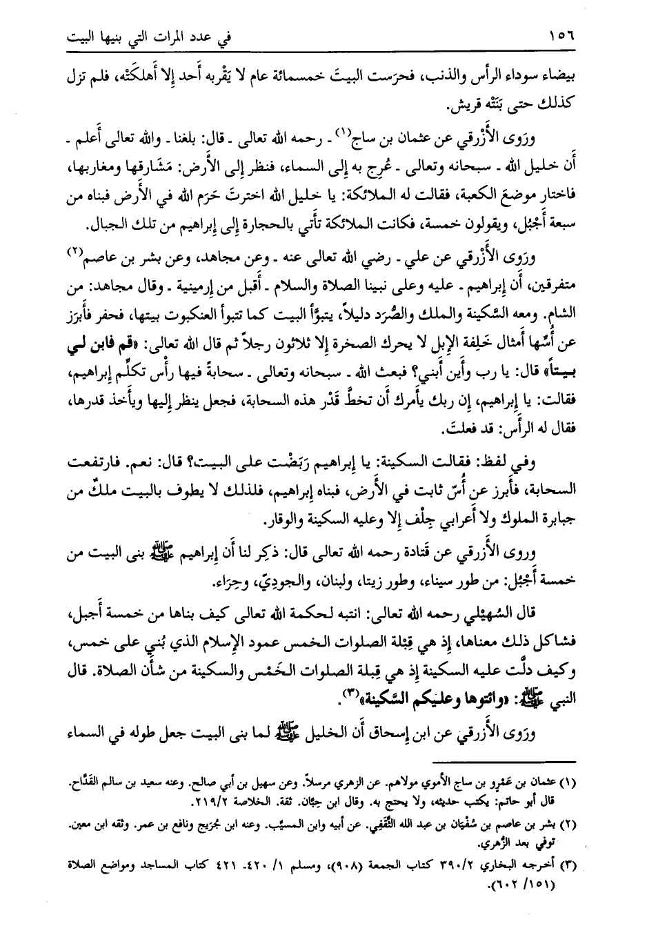 وفي لفظ: فقالت السكينة: يا إبراهيم ربضت على البيت؟ قال: نعم. فارتفعت السحابة، فأبرز عن أسّ ثابت في الأرض، فبناه إبراهيم، فلذلك لا يطوف بالبيت ملك من جبابرة الملوك ولا أعرابي جلف إلا وعليه السكينة والوقار.