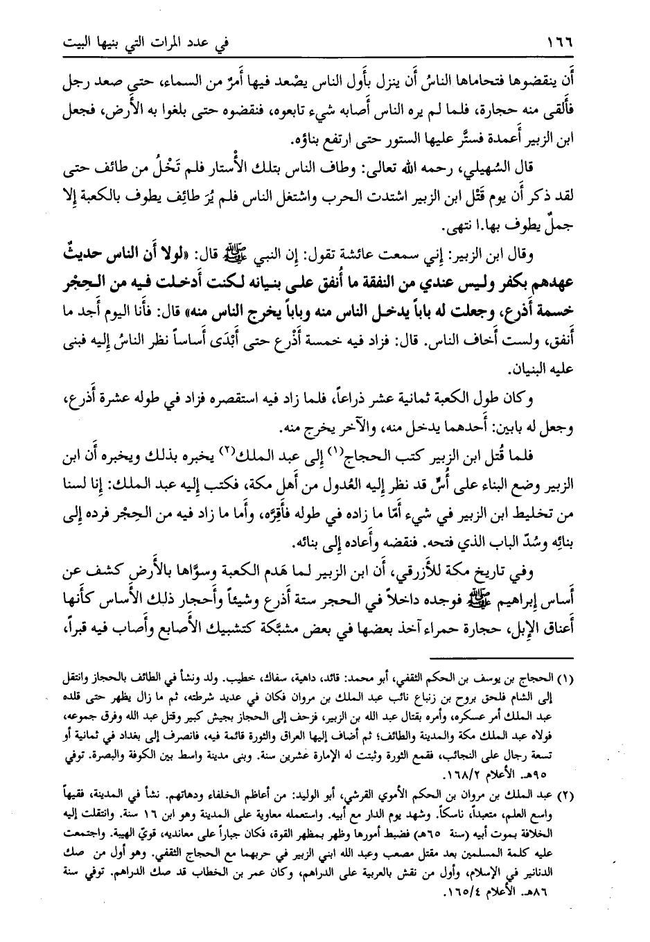 فلما قتل ابن الزبير كتب الحجاج [ (1) ] إلى عبد الملك [ (2) ] يخبره بذلك ويخبره أن ابن الزبير وضع البناء على أسّ قد نظر إليه العدول من أهل مكة، فكتب إليه عبد الملك: إنا لسنا من تخليط ابن الزبير في شيء أمّا ما زاده في طوله فأقرّه، وأما ما زاد فيه من الحجر فرده إلى بنائه وسدّ الباب الذي فتحه. فنقضه وأعاده إلى بنائه.
