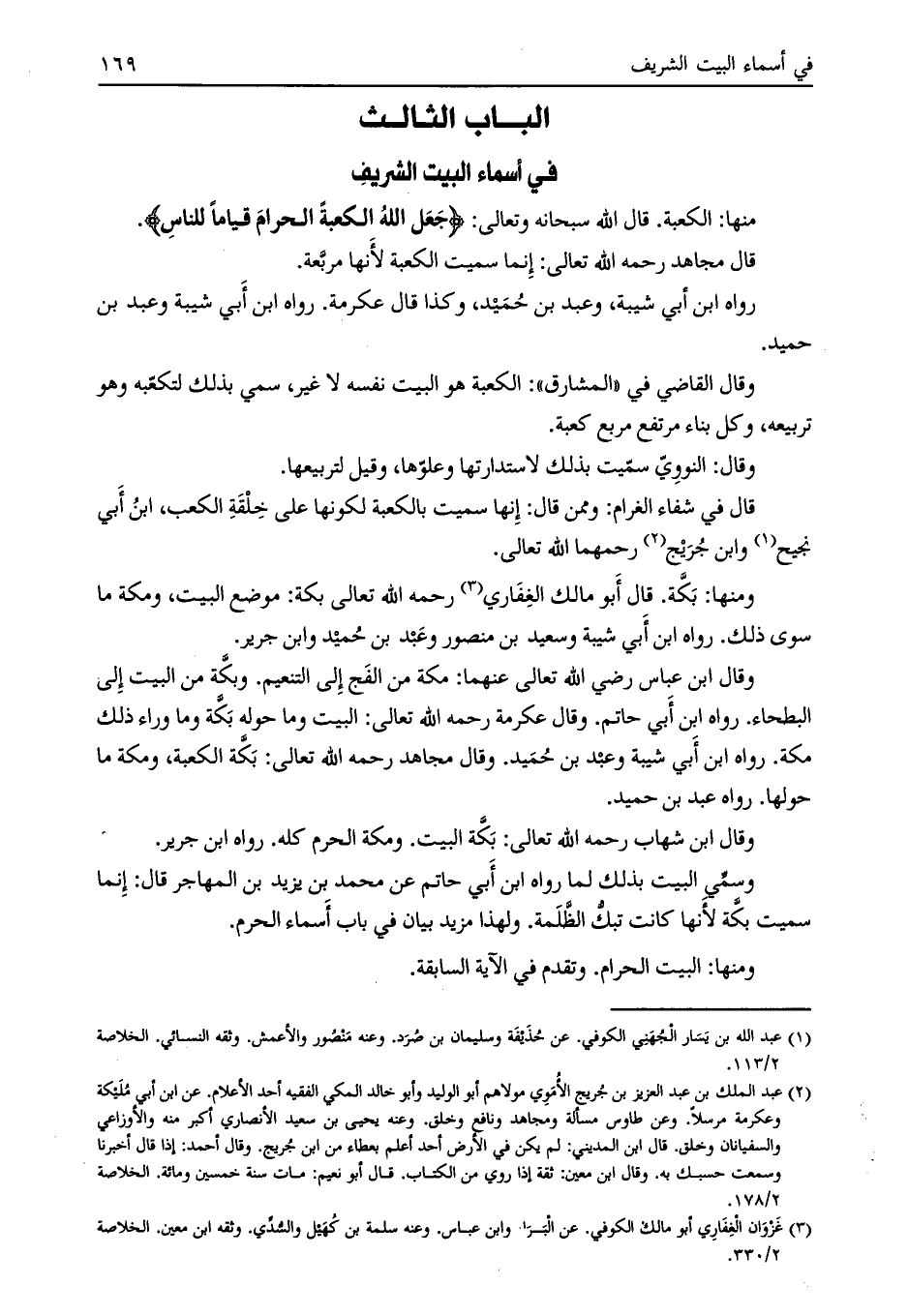 ومنها: بكّة. قال أبو مالك الغفاري [ (3) ] رحمه الله تعالى بكة: موضع البيت، ومكة ما سوى ذلك. رواه ابن أبي شيبة وسعيد بن منصور وعبد بن حميد وابن جرير.