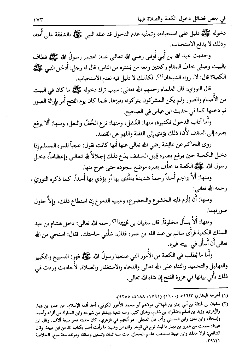 وحديث عبد الله بن أبي أوفى رضي الله تعالى عنه: اعتمر رسول الله صلى الله عليه وسلم فطاف بالبيت وصلى خلف المقام ركعتين ومعه من يستره من الناس، قال له رجل: أدخل النبي صلى الله عليه وسلّم الكعبة؟ قال: لا. رواه الشيخان