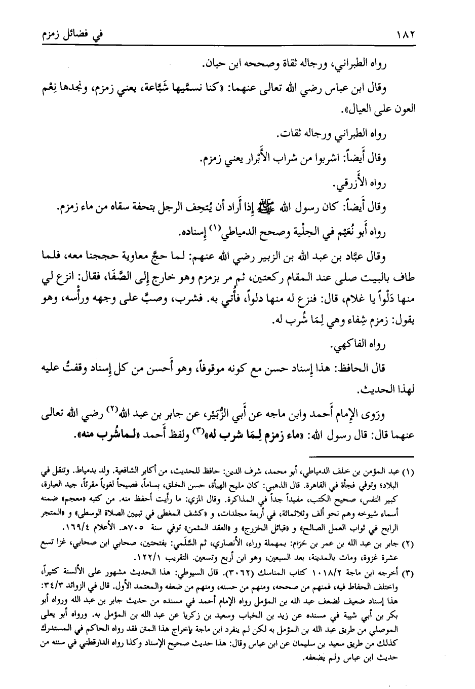 وروى الإمام أحمد وابن ماجة عن أبي الزبير، عن جابر بن عبد الله [ (2) ] رضي الله تعالى عنهما قال: قال رسول الله: «ماء زمزم لما شرب له»