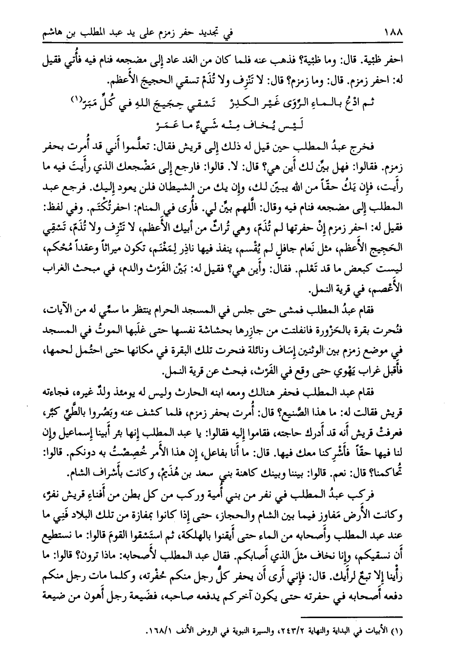 فقيل له: احفر زمزم إن حفرتها لم تذمّ، وهي تراث من أبيك الأعظم، لا تنزف ولا تذم، تسقي الحجيج الأعظم، مثل نعام جافل لم يقسم، ينفذ فيها ناذر لمغنم، تكون ميراثاً وعقداً محكم، ليست كبعض ما قد تعلم. فقال: وأين هي؟ فقيل له: بين الفرث والدم، في مبحث الغراب الأعصم، في قرية النمل.