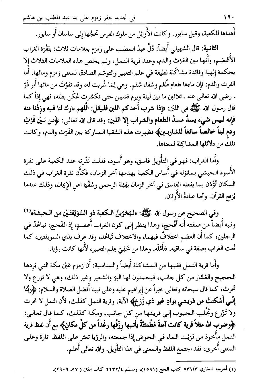 الثانية: قال السّهيلي أيضاً: دلّ عبد المطلب على زمزم بعلامات ثلاث: بنقرة الغراب الأعصم، وأنها بين الفرث والدم، وعند قرية النمل، ولم يخص هذه العلامات الثلاث إلا بحكمة إلهية وفائدة مشاكلة لطيفة في علم التعبير والتوسّم الصادق لمعنى زمزم ومائها. أما الفرث والدم: فإن ماءها طعام طعم وشفاء سقم. وهي لما شربت له، وقد تقوّت من مائها أبو ذر- رضي الله تعالى عنه- ثلاثين ما بين ليلة ويوم فسمن حتى تكسّرت عكن بطنه، فهي إذا كما