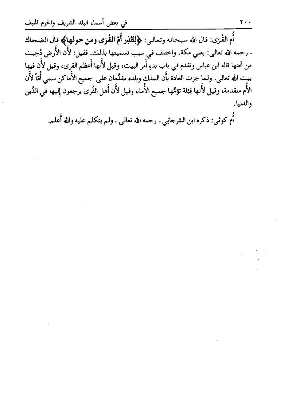 أم القرى: قال الله سبحانه وتعالى: لِتُنْذِرَ أُمَّ الْقُرى وَمَنْ حَوْلَها قال الضحاك- رحمه الله تعالى: يعني مكة. واختلف في سبب تسميتها بذلك. فقيل: لأن الأرض دحيت من تحتها قاله ابن عباس وتقدم في باب بدء أمر البيت، وقيل لأنها أعظم القرى، وقيل لأن فيها بيت الله تعالى. ولما جرت العادة بأن الملك وبلده مقدمان على جميع الأماكن سمي أمّاً لأن الأم متقدمة، وقيل لأنها قبلة تؤمّها جميع الأمة، وقيل لأن أهل القرى يرجعون إليها في الدين والدنيا.