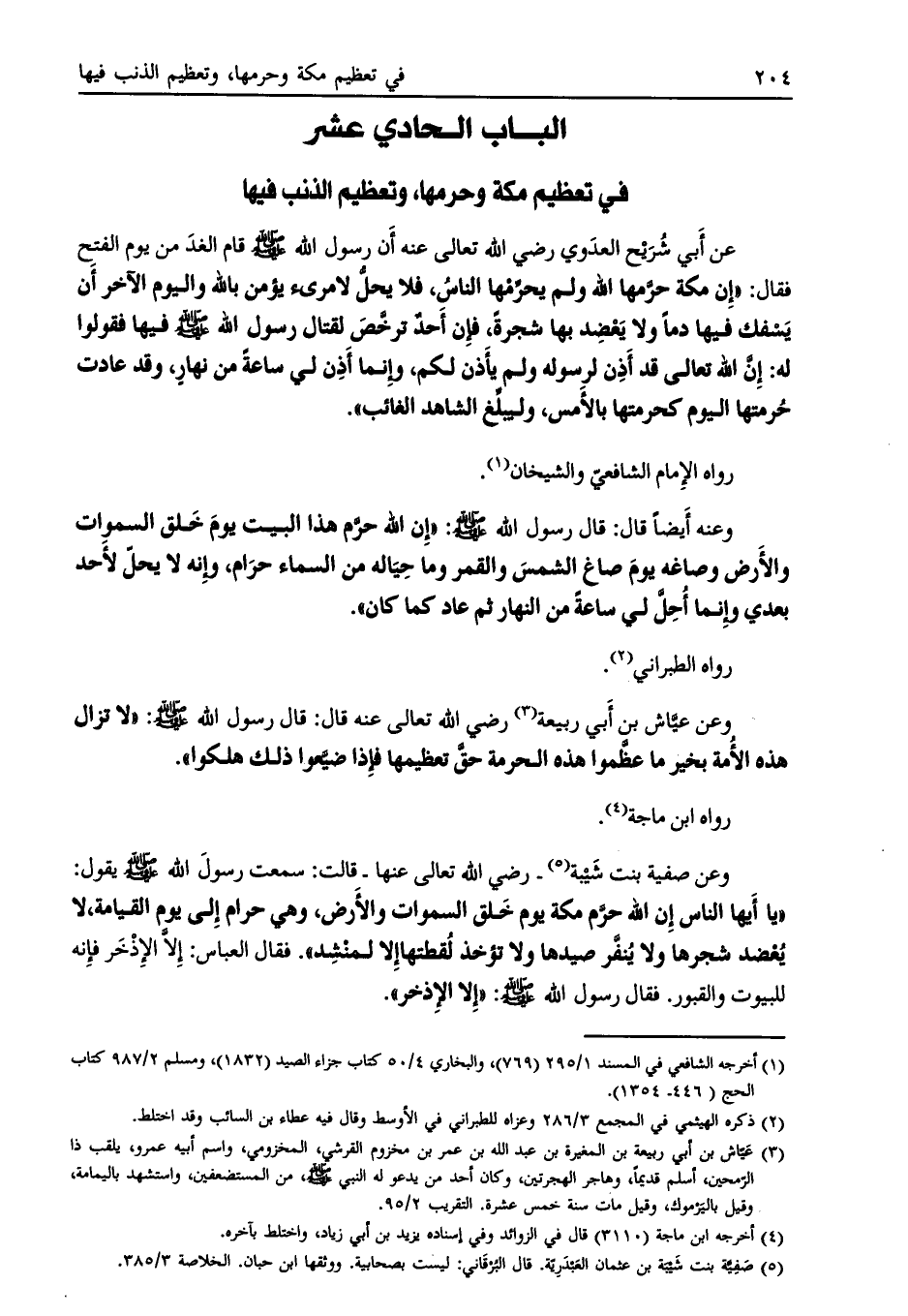 عن أبي شريح العدوي رضي الله تعالى عنه أن رسول الله صلى الله عليه وسلم قام الغد من يوم الفتح فقال: «إن مكة حرّمها الله ولم يحرّمها الناس، فلا يحل لامرئ يؤمن بالله واليوم الآخر أن يسفك فيها دماً ولا يعضد بها شجرة، فإن أحد ترخّص لقتال رسول الله صلى الله عليه وسلم فيها فقولوا له: إن الله تعالى قد أذن لرسوله ولم يأذن لكم، وإنما أذن لي ساعة من نهار، وقد عادت حرمتها اليوم كحرمتها بالأمس، وليبلّغ الشاهد الغائب» .