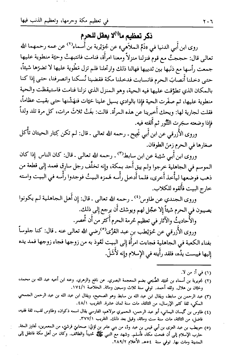ذكر تعظيم ما [ (1) ] لا يعقل للحرم روى ابن أبي الدنيا في «ذم الملاهي» عن جويرية بن أسماء [ (2) ] عن عمه رحمهما الله تعالى قال: حججت مع قوم فنزلنا منزلاً ومعنا امرأة، فنامت فانتبهت وحيّة منطوية عليها جمعت رأسها مع ذنبها بين ثدييها فهالنا ذلك وارتحلنا فلم تزل مطوية عليها لا تضرّها شيئاً، حتى دخلنا أنصاب الحرم فانسابت فدخلنا مكة فقضينا نسكنا وانصرفنا، حتى إذا كنا بالمكان الذي تطوّقت عليها فيه الحية، وهو المنزل الذي نزلنا فنامت فاستيقظت والحية منطوية عليها، ثم صفّرت الحية فإذا بالوادي يسيل علينا حيّات فنهشنها حتى بقيت عظاماً، فقلت لجارية لها: ويحك أخبرينا عن هذه المرأة. قالت: بغت ثلاث مرات، كل مرة تلد ولداً فإذا وضعته سجرت التّنور ثم ألقته فيه.