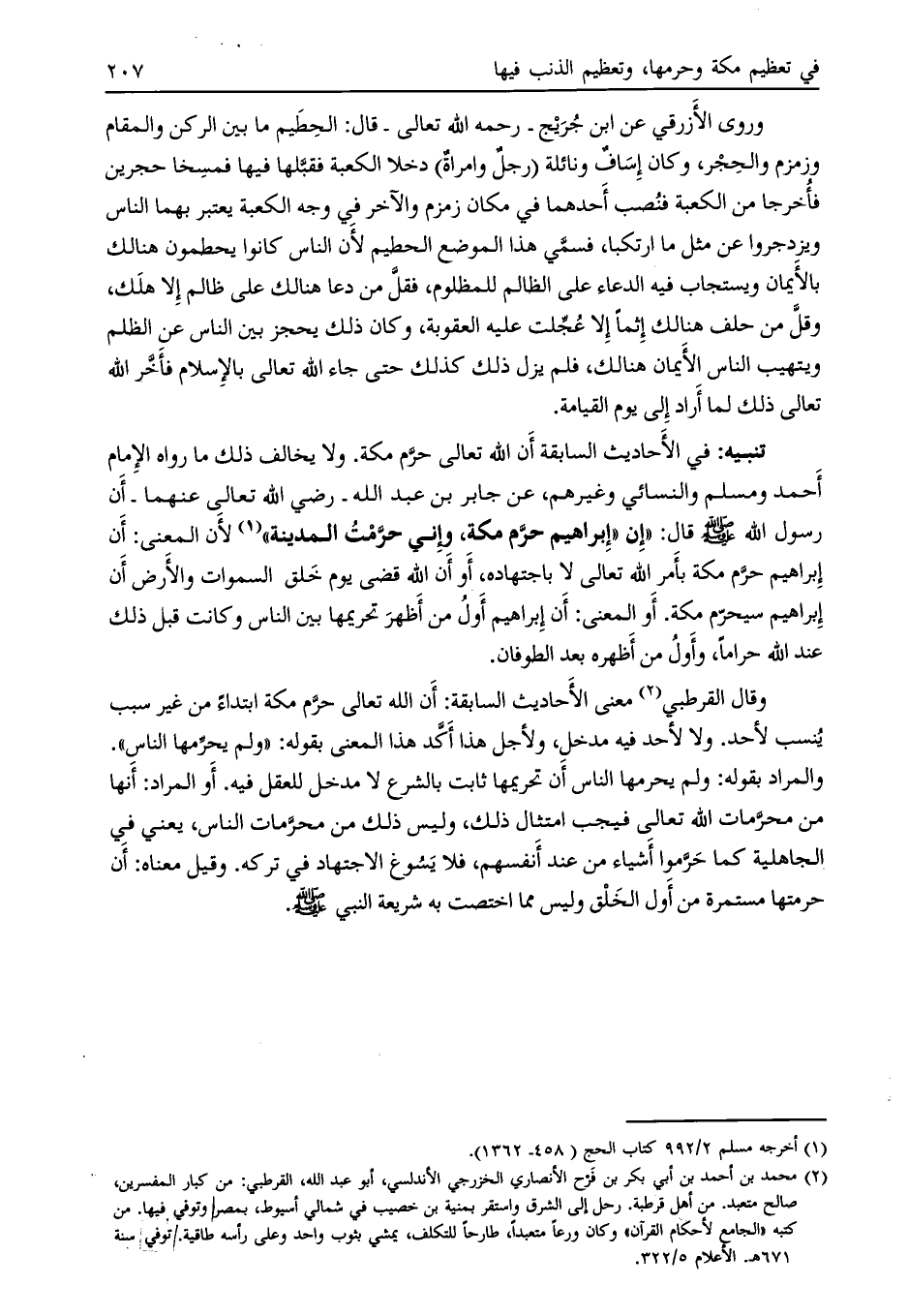 وقال القرطبي [ (2) ] معنى الأحاديث السابقة: أن الله تعالى حرّم مكة ابتداء من غير سبب ينسب لأحد. ولا لأحد فيه مدخل، ولأجل هذا أّكد هذا المعنى بقوله: «ولم يحرمها الناس» .