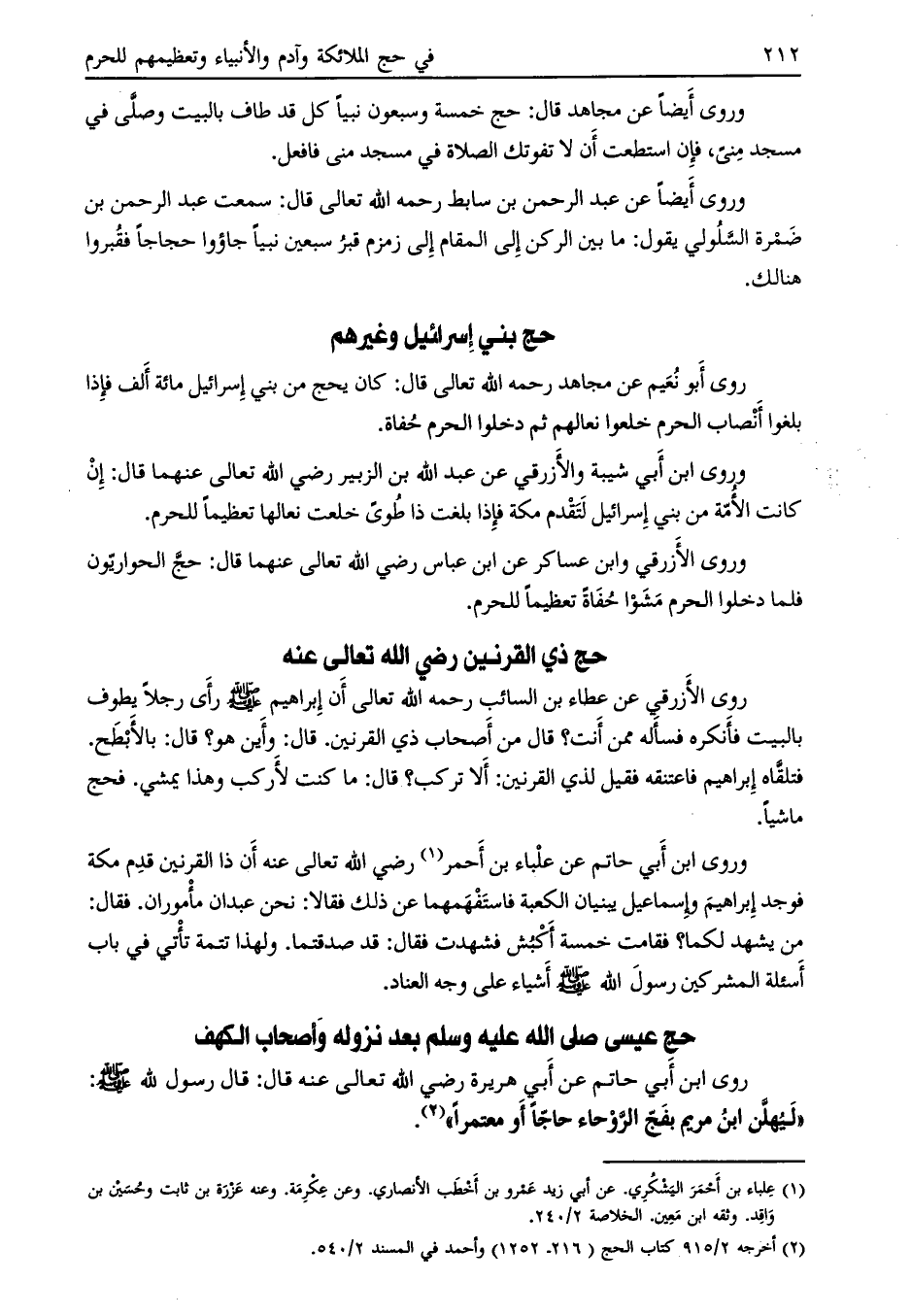 وروى أيضا عن مجاهد قال: حج خمسة وسبعون نبياً كل قد طاف بالبيت وصلّى في مسجد منى، فإن استطعت أن لا تفوتك الصلاة في مسجد منى فافعل.