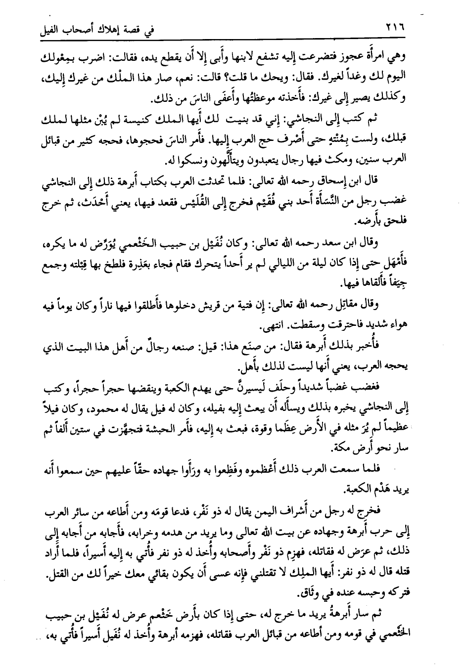 فخرج له رجل من أشراف اليمن يقال له ذو نفر، فدعا قومه ومن أطاعه من سائر العرب إلى حرب أبرهة وجهاده عن بيت الله تعالى وما يريد من هدمه وخرابه، فأجابه من أجابه إلى ذلك، ثم عرض له فقاتله، فهزم ذو نفر وأصحابه وأخذ له ذو نفر فأتي به إليه أسيراً، فلما أراد قتله قال له ذو نفر: أيها الملك لا تقتلني فإنه عسى أن يكون بقائي معك خيراً لك من القتل.