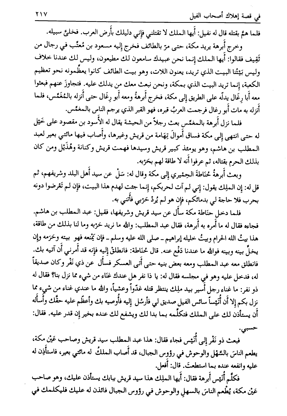 فكلّم أنيس أبرهة فقال: أيها الملك هذا سيد قريش ببابك يستأذن عليك، وهو صاحب عين مكة، يطعم الناس بالسهل والوحوش في رؤوس الجبال فائذن له عليك فليكلمك في