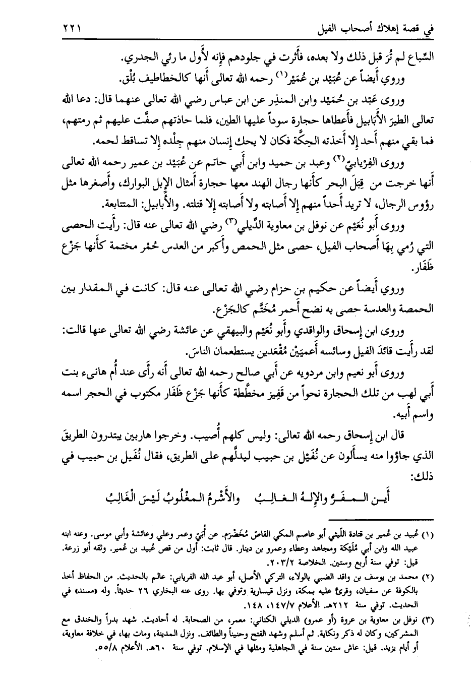 وروى أبو نعيم عن نوفل بن معاوية الدّيلي [ (3) ] رضي الله تعالى عنه قال: رأيت الحصى التي رمي بها أصحاب الفيل، حصى مثل الحمص وأكبر من العدس حمر مختمة كأنها جزع ظفار.