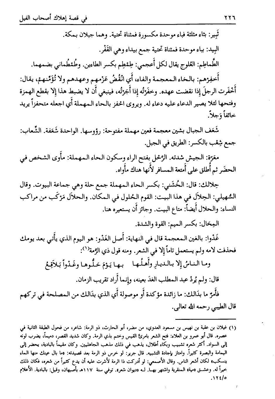 [ (1) ] غيلان بن عقبة بن نهيس بن مسعود العدوي، من مضر، أبو الحارث، ذو الرمة: شاعر، من فحول الطبقة الثانية في عصره. قال أبو عمرو بن العلاء: فتح الشعر بامرئ القيس وختم بذي الرمة. وكان شديد القصر، دميما، يضرب لونه إلى السواد. أكثر شعره تشبيب وبكاء أطلال، يذهب في ذلك مذهب الجاهليين. وكان مقيما بالبادية، يحضر إلى اليمامة والبصرة كثيرا. وامتاز بإجادة التشبيه. قال جرير: لو خرس ذو الرمة بعد قصيدته: «ما بال عينك منها الماء ينسكب» لكان أشعر الناس. وقال الأصمعي: لو أدركت ذا الرمة لأشرت عليه أن يدع كثيرا من شعره، فكان ذلك خيرا له. وعشق «مية» المنقرية واشتهر بها. له «ديوان شعر» . توفي سنة 117 هـ بأصبهان، وقيل: بالبادية. الأعلام 5/ 124.