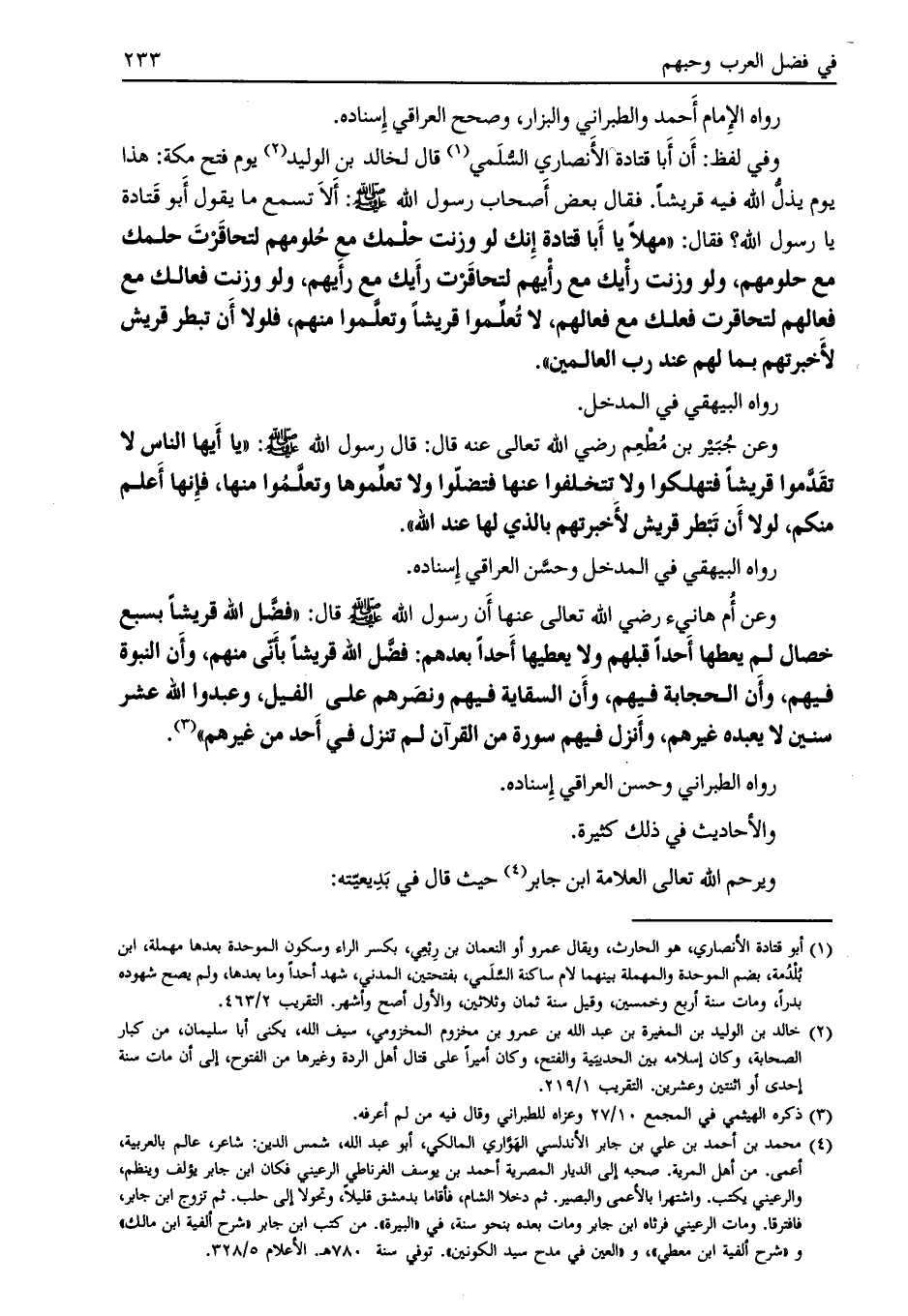 وعن جبير بن مطعم رضي الله تعالى عنه قال: قال رسول الله صلى الله عليه وسلم: «يا أيها الناس لا تقدّموا قريشاً فتهلكوا ولا تتخلفوا عنها فتضلّوا ولا تعلّموها وتعلّموا منها، فإنها أعلم منكم، لولا أن تبطر قريش لأخبرتهم بالذي لها عند الله» .
