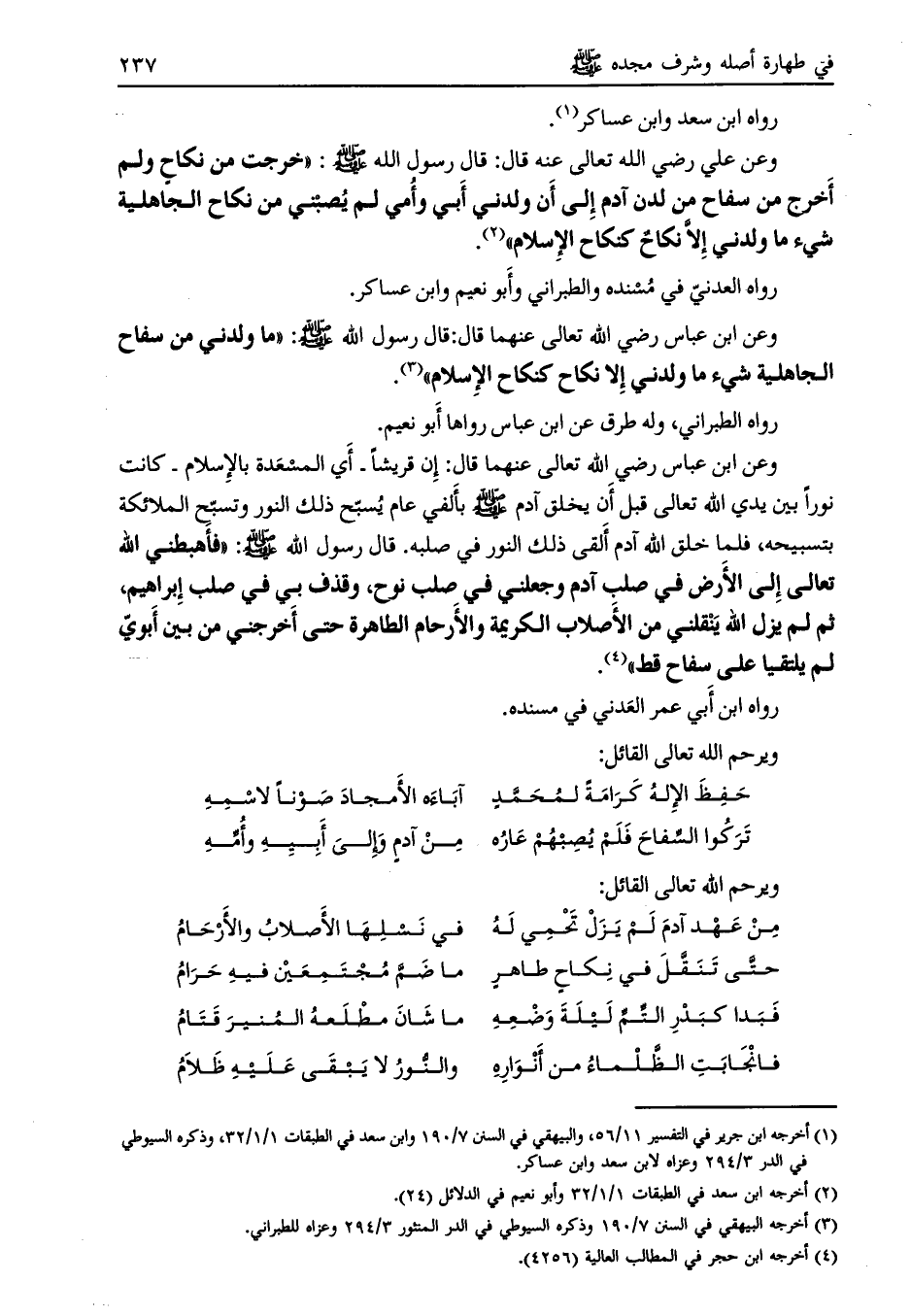 وعن علي رضي الله تعالى عنه قال: قال رسول الله صلى الله عليه وسلّم: «خرجت من نكاح ولم أخرج من سفاح من لدن آدم إلى أن ولدني أبي وأمي لم يصبني من نكاح الجاهلية شيء ما ولدني إلا نكاح كنكاح الإسلام» [ (2) ] .