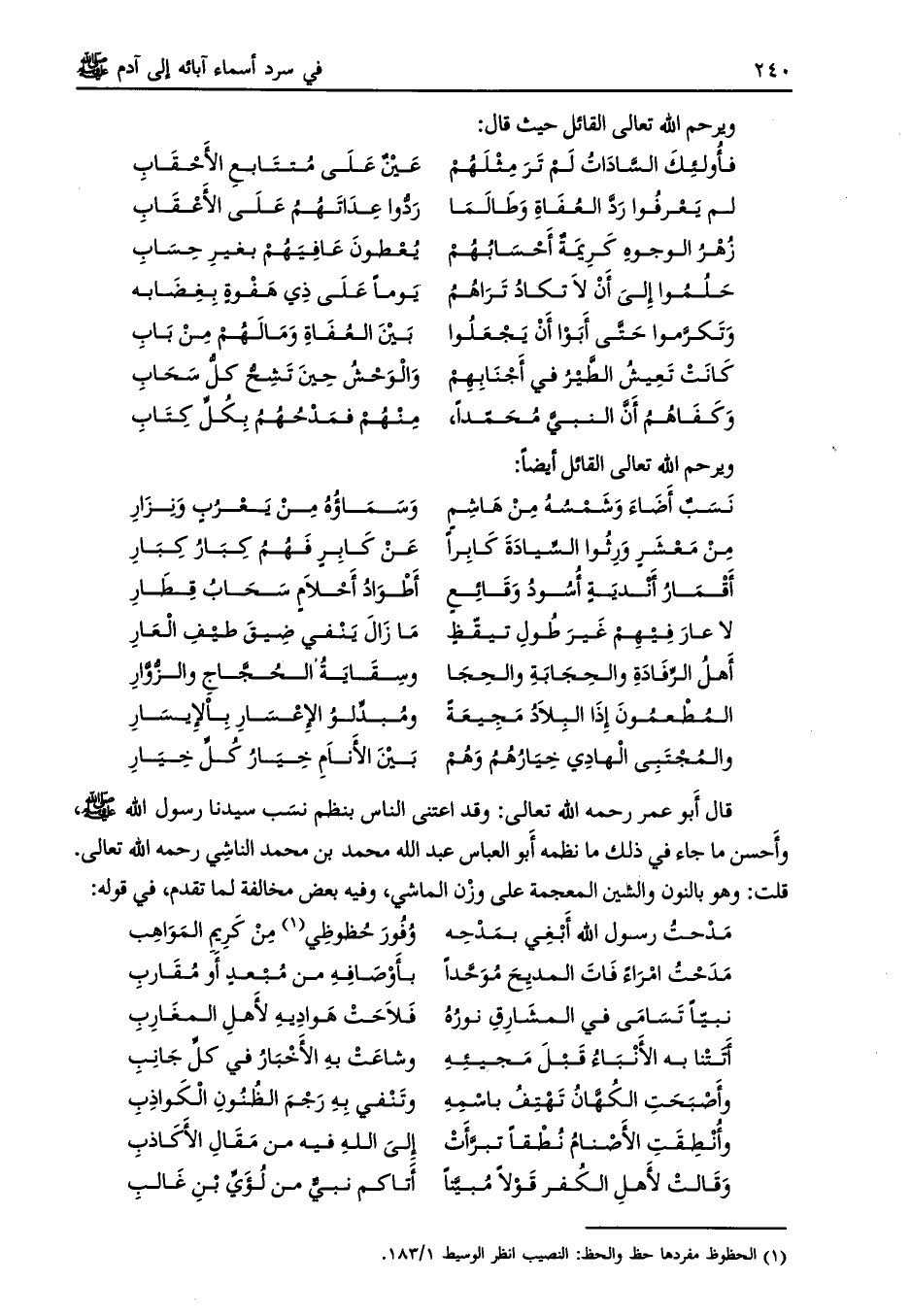 قال أبو عمر رحمه الله تعالى: وقد اعتنى الناس بنظم نسب سيدنا رسول الله صلى الله عليه وسلّم، وأحسن ما جاء في ذلك ما نظمه أبو العباس عبد الله محمد بن محمد الناشي رحمه الله تعالى.