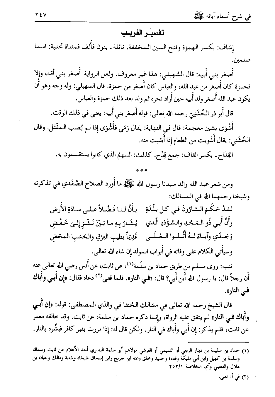 قال الشيخ رحمه الله تعالى في مسالك الحنفا في والدي المصطفى: قوله: «إن أبي وأباك في النار» لم يتفق عليه الرواة، وإنما ذكره حماد بن سلمة، عن ثابت. وقد خالفه معمر عن ثابت، فلم يذكر: إن أبي وأباك في النار. ولكن قال له: إذا مررت بقبر كافر فبشّره بالنار.