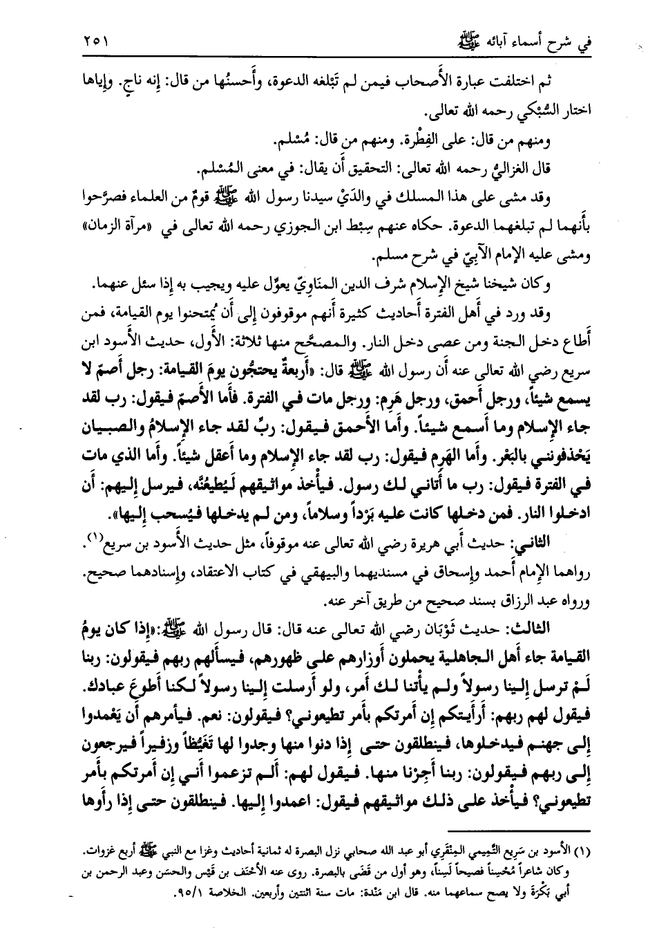 حديث الأسود ابن سريع رضي الله تعالى عنه أن رسول الله صلى الله عليه وسلم قال: «أربعة يحتجّون يوم القيامة: رجل أصم لا يسمع شيئاً، ورجل أحمق، ورجل هرم: ورجل مات في الفترة. فأما الأصم فيقول: ربّ لقد جاء الإسلام وما أسمع شيئاً. وأما الأحمق فيقول: ربّ لقد جاء الإسلام والصبيان يحذفونني بالبعر. وأما الهرم فيقول: ربّ لقد جاء الإسلام وما أعقل شيئاً. وأما الذي مات في الفترة فيقول: رب ما أتاني لك رسول. فيأخذ مواثيقهم ليطيعنّه، فيرسل إليهم: أن ادخلوا النار. فمن دخلها كانت عليه برداً وسلاماً، ومن لم يدخلها فيسحب إليها» .