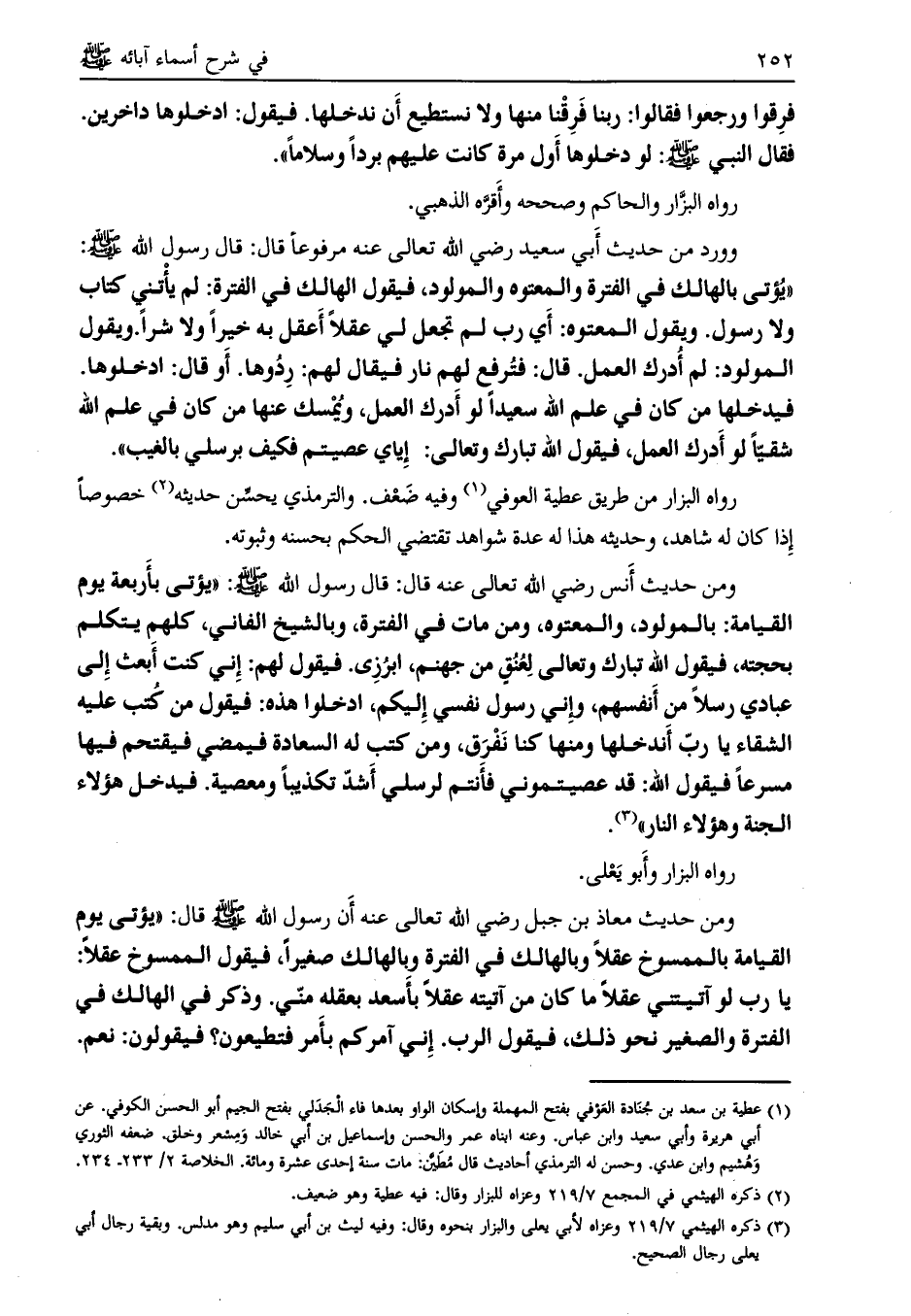 وورد من حديث أبي سعيد رضي الله تعالى عنه مرفوعاً قال: قال رسول الله صلى الله عليه وسلم: «يؤتى بالهالك في الفترة والمعتوه والمولود، فيقول الهالك في الفترة: لم يأتني كتاب ولا رسول. ويقول المعتوه: أي رب لم تجعل لي عقلاً أعقل به خيراً ولا شراً. ويقول المولود: لم أدرك العمل. قال: فترفع لهم نار فيقال لهم: ردوها. أو قال: ادخلوها.