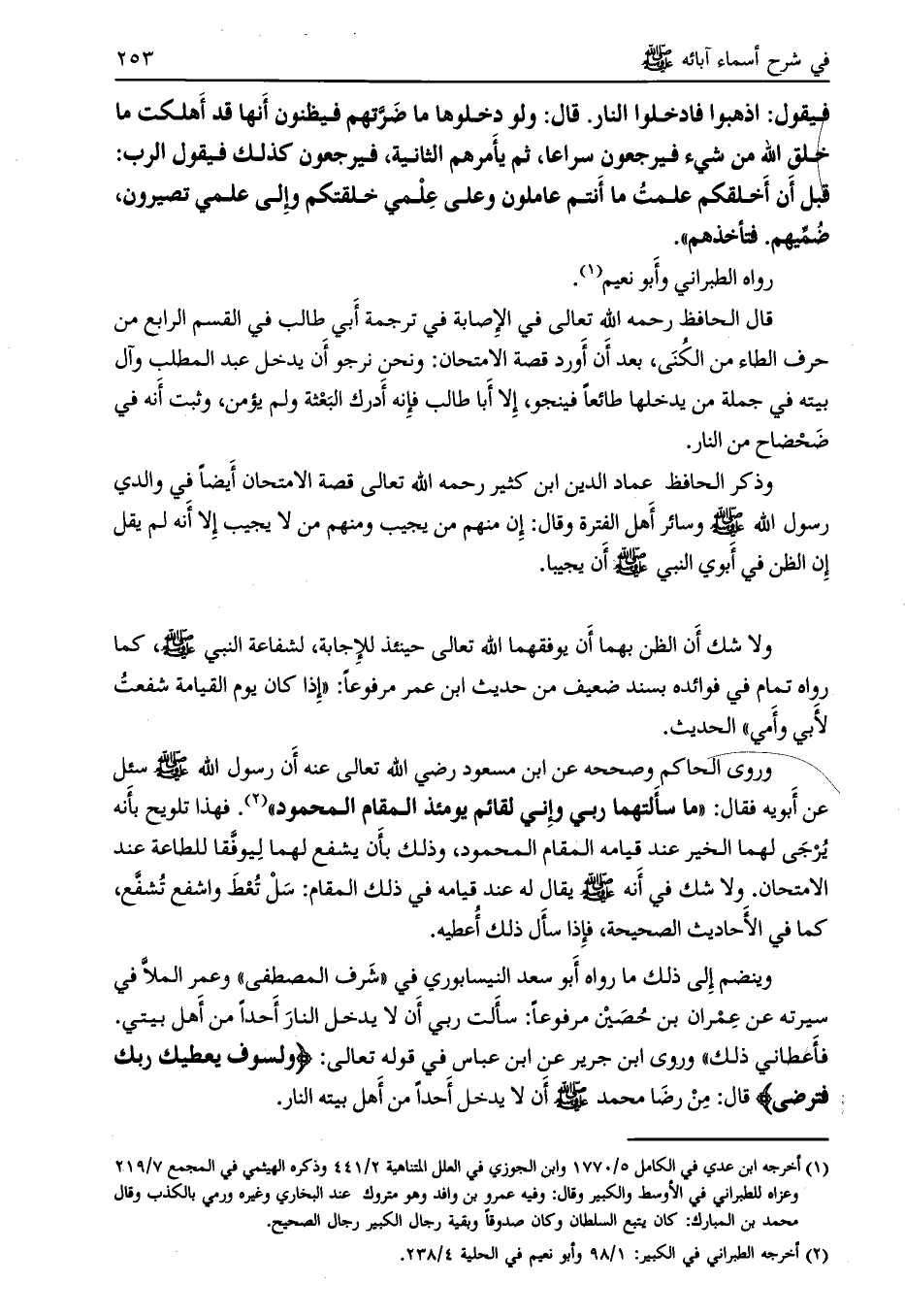 ولا شك أن الظن بهما أن يوفقهما الله تعالى حينئذ للإجابة، لشفاعة النبي صلى الله عليه وسلم، كما رواه تمام في فوائده بسند ضعيف من حديث ابن عمر مرفوعا: «إذا كان يوم القيامة شفعت لأبي وأمي» الحديث.
