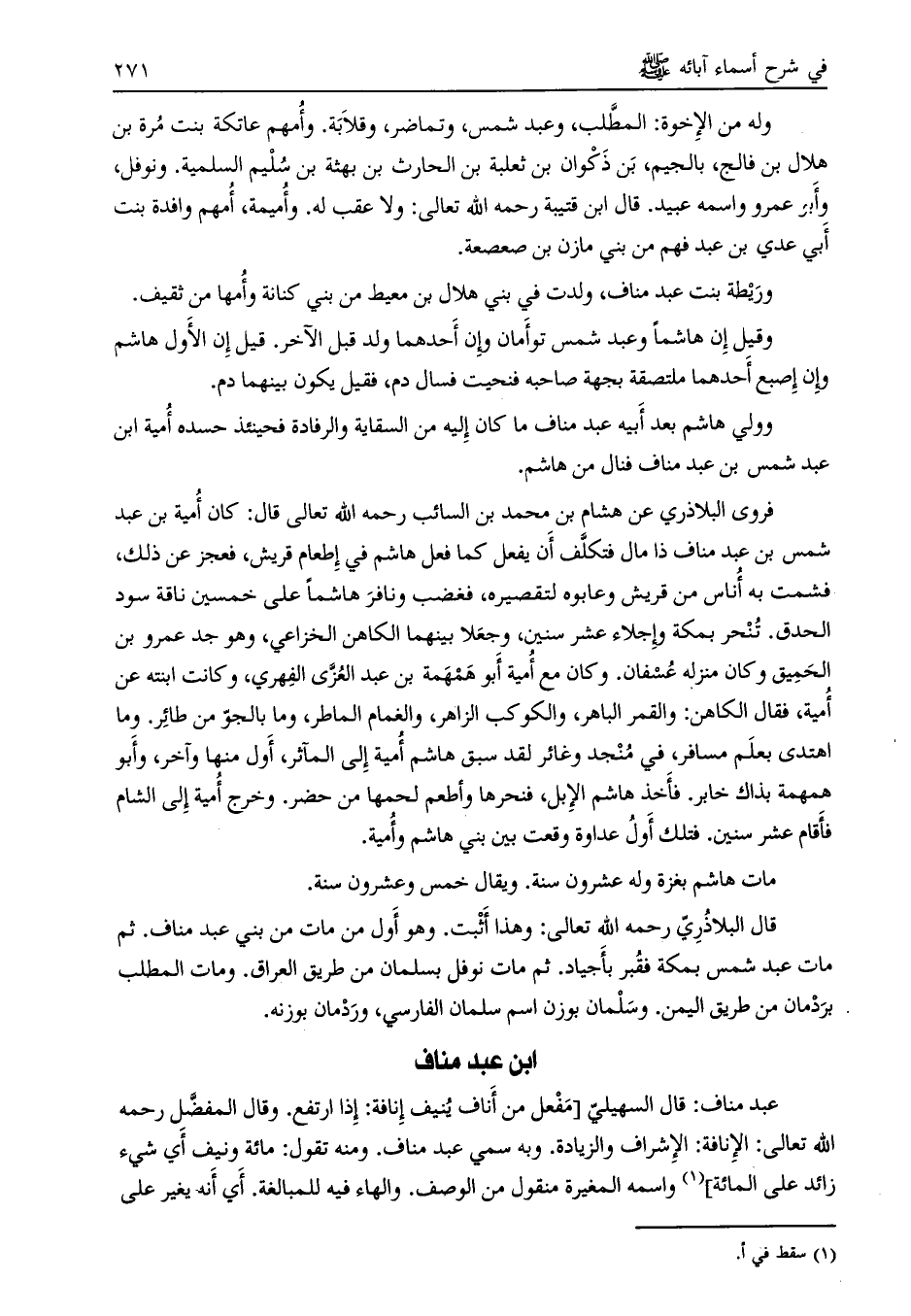 ابن عبد مناف عبد مناف: قال السهيلي [مفعل من أناف ينيف إنافة: إذا ارتفع. وقال المفضّل رحمه الله تعالى: الإنافة: الإشراف والزيادة. وبه سمي عبد مناف. ومنه تقول: مائة ونيف أي شيء زائد على المائة] [ (1) ] واسمه المغيرة منقول من الوصف. والهاء فيه للمبالغة. أي أنه يغير على