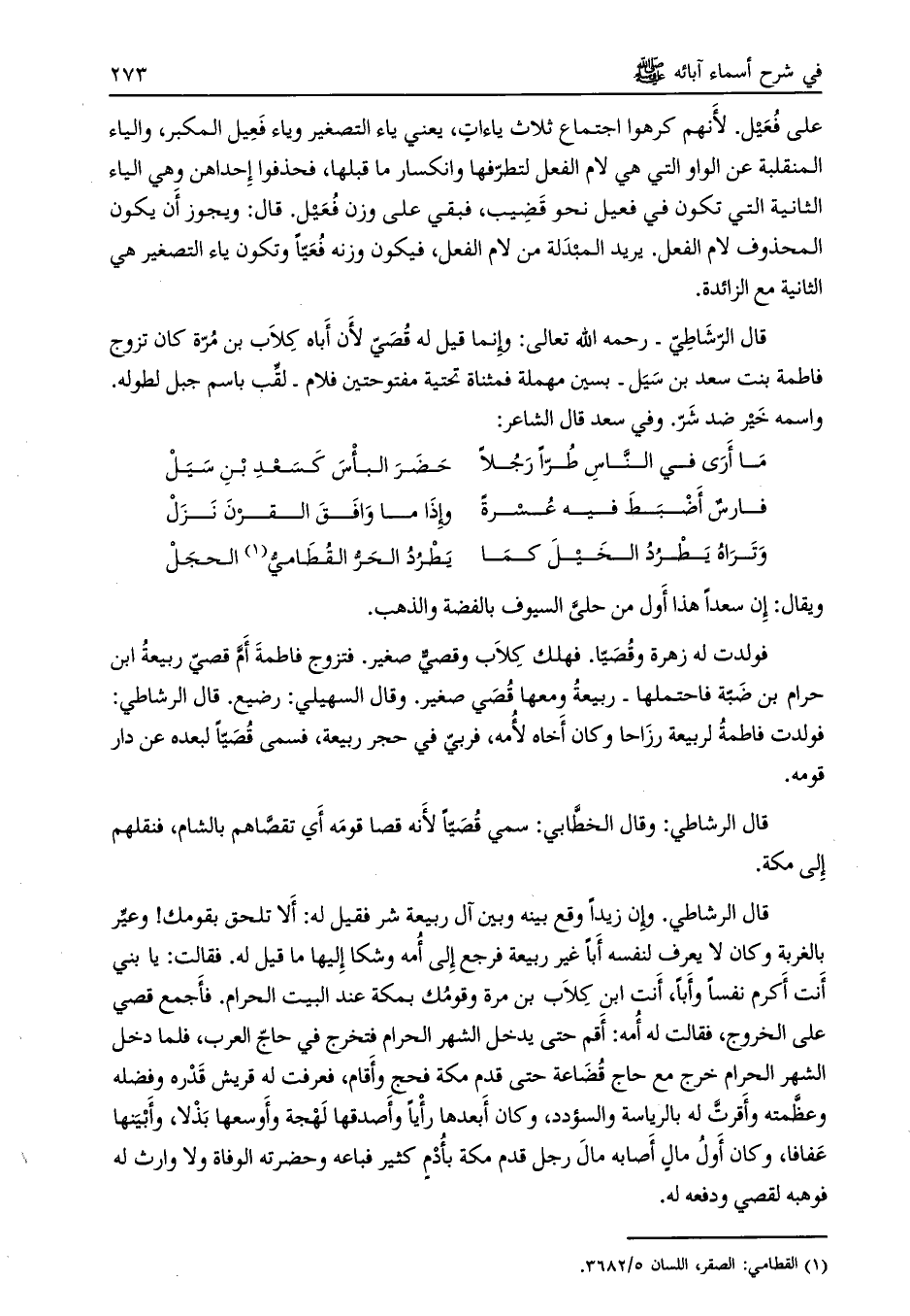 قال الرشاطيّ- رحمه الله تعالى: وإنما قيل له قُصيّ لأن أباه كلاب بن مرة كان تزوج فاطمة بنت سعد بن سيل- بسين مهملة فمثناة تحتية مفتوحتين فلام- لقّب باسم جبل لطوله.