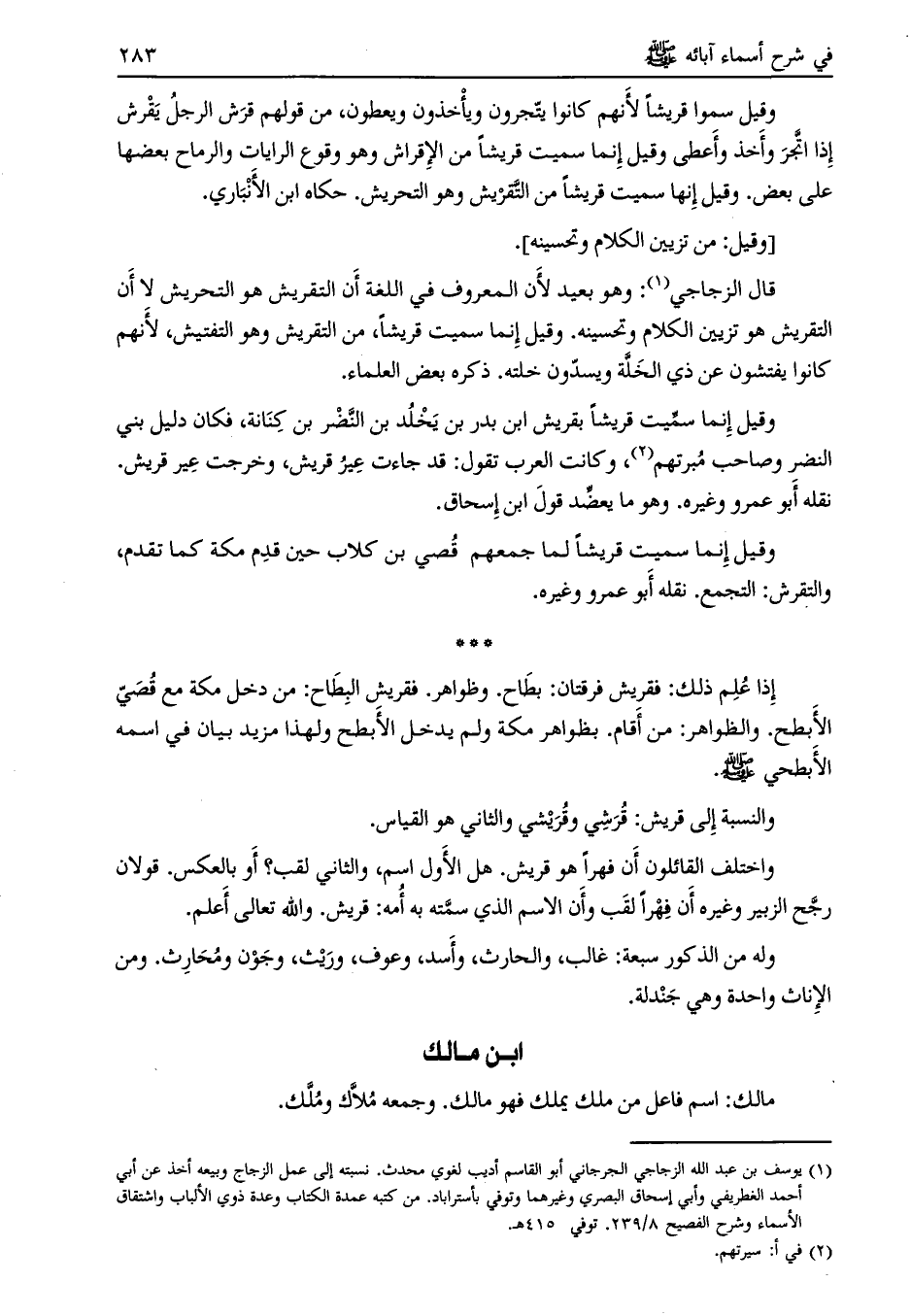 قال الزجاجي [ (1) ] : وهو بعيد لأن المعروف في اللغة أن التقريش هو التحريش لا أن التقريش هو تزيين الكلام وتحسينه. وقيل إنما سميت قريشاً، من التقريش وهو التفتيش، لأنهم كانوا يفتشون عن ذي الخلّة ويسدّون خلته. ذكره بعض العلماء.