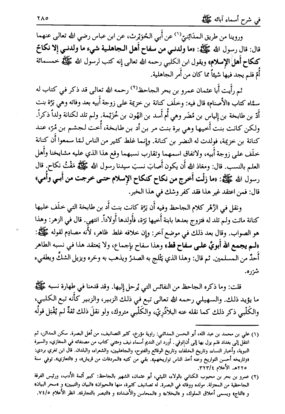 قلت: وما ذكره الجاحظ من النفائس التي يرحل إليها. وقد قدمنا في طهارة نسبه صلى الله عليه وسلم ما يؤيد ذلك. والسهيلي رحمه الله تعالى تبع في ذلك الزبير، والزبير كأنه تبع الكلبي، والكلبي ذكر ذلك كما نقله عنه البلاذريّ، والكلبي متروك، ولو نقل ذلك ثقةٌ لم يقبل قوله