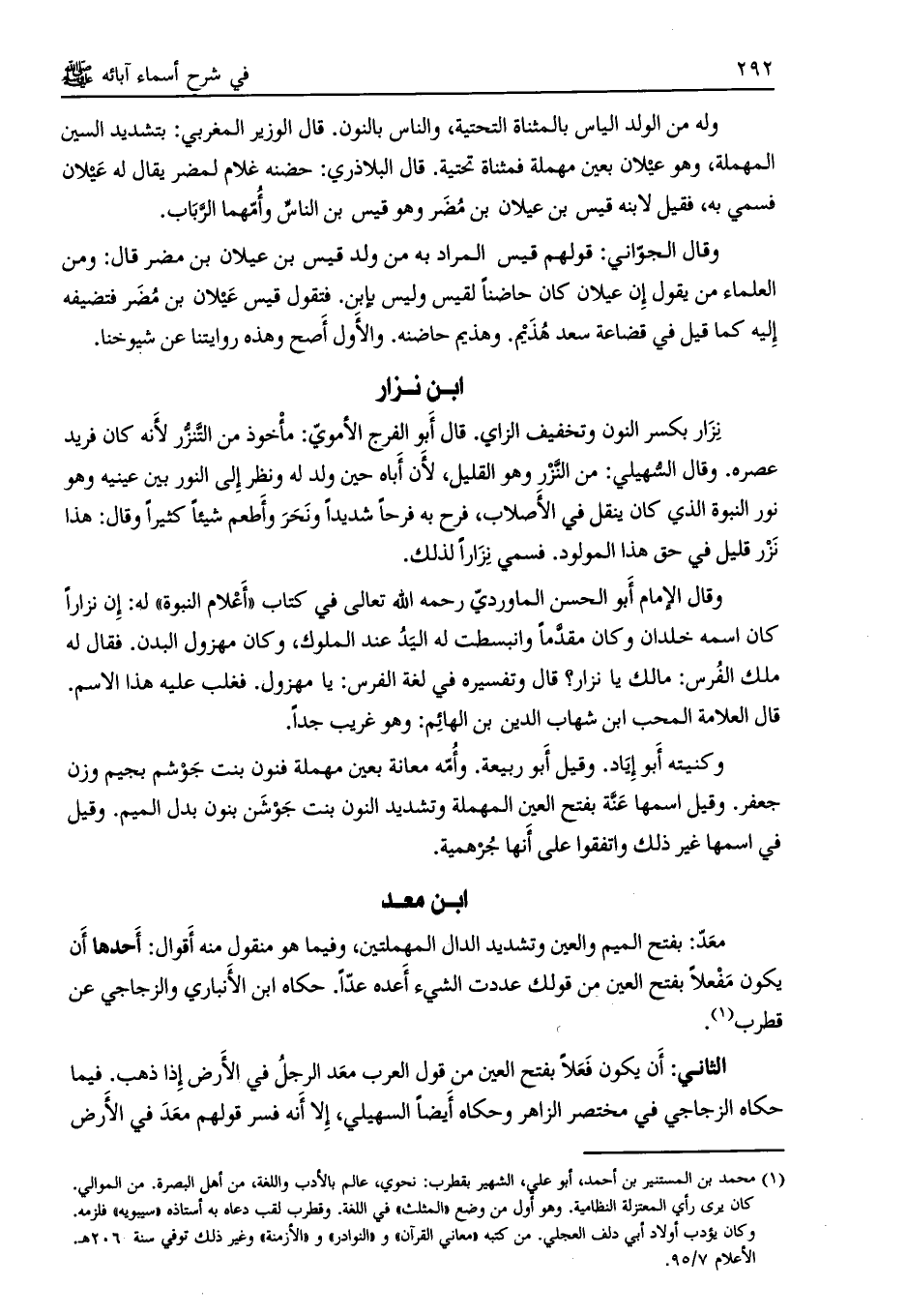 ابن نزار نزار بكسر النون وتخفيف الزاي. قال أبو الفرج الأمويّ: مأخوذ من التّنزّر لأنه كان فريد عصره. وقال السهيلي: من النّزر وهو القليل، لأن أباه حين ولد له ونظر إلى النور بين عينيه وهو نور النبوة الذي كان ينقل في الأصلاب، فرح به فرحاً شديداً ونحر وأطعم شيئاً كثيراً وقال: هذا نزر قليل في حق هذا المولود. فسمي نزاراً لذلك.