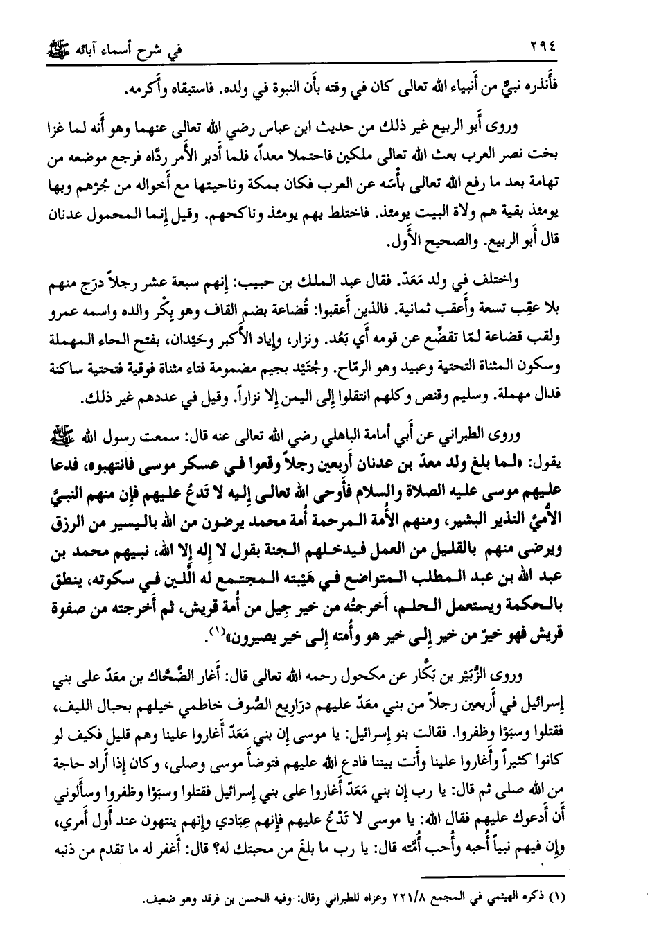 وروى الطبراني عن أبي أمامة الباهلي رضي الله تعالى عنه قال: سمعت رسول الله صلى الله عليه وسلم يقول: «لما بلغ ولد معد بن عدنان أربعين رجلاً وقعوا في عسكر موسى فانتهبوه، فدعا عليهم موسى عليه الصلاة والسلام فأوحى الله تعالى إليه لا تدعُ عليهم فإن منهم النبيّ الأميّ النذير البشير، ومنهم الأمة المرحمة أمة محمد يرضون من الله باليسير من الرزق ويرضى منهم بالقليل من العمل فيدخلهم الجنة بقول لا إله إلا الله، نبيهم محمد بن عبد الله بن عبد المطلب المتواضع في هيبته المجتمع له اللين في سكوته، ينطق بالحكمة ويستعمل الحلم، أخرجته من خير جيل من أمة قريش، ثم أخرجته من صفوة قريش فهو خيرٌ من خير إلى خير هو وأمته إلى خير يصيرون»