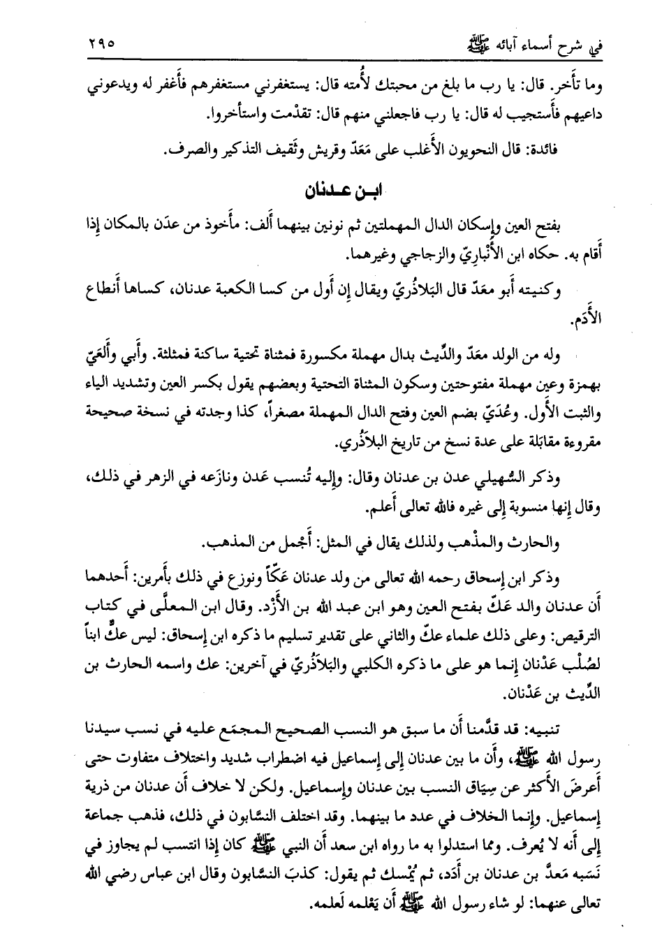 تنبيه: قد قدّمنا أن ما سبق هو النسب الصحيح المجمع عليه في نسب سيدنا رسول الله صلى الله عليه وسلم، وأن ما بين عدنان إلى إسماعيل فيه اضطراب شديد واختلاف متفاوت حتى أعرض الأكثر عن سياق النسب بين عدنان وإسماعيل. ولكن لا خلاف أن عدنان من ذرية إسماعيل. وإنما الخلاف في عدد ما بينهما. وقد اختلف النسّابون في ذلك، فذهب جماعة إلى إنه لا يعرف. ومما استدلوا به ما