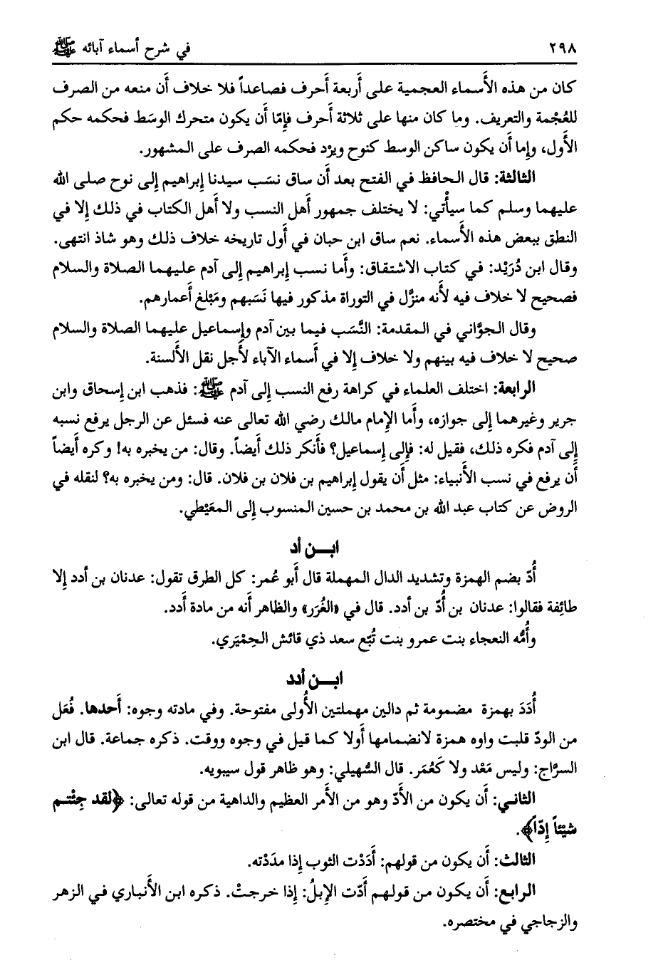 الثالثة: قال الحافظ في الفتح بعد أن ساق نسب سيدنا إبراهيم إلى نوح صلى الله عليهما وسلم كما سيأتي: لا يختلف جمهور أهل النسب ولا أهل الكتاب في ذلك إلا في النطق ببعض هذه الأسماء. نعم ساق ابن حبان في أول تاريخه خلاف ذلك وهو شاذ انتهى.