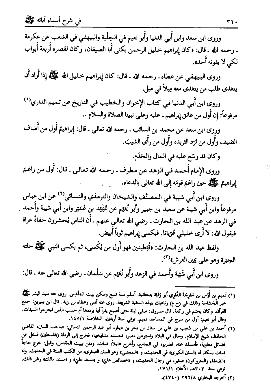 وروى ابن سعد وابن أبي الدنيا وأبو نعيم في الحلية والبيهقي في الشعب عن عكرمة- رحمه الله- قال: «كان إبراهيم خليل الرحمن يكنى أبا الضيفان، وكان لقصره أربعة أبواب لكي لا يفوته أحد» .