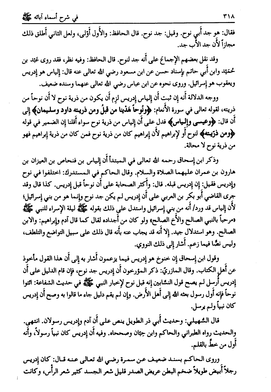 ووجه الدلالة أنه إن ثبت أن إلياس إدريس لزم أن يكون من ذرية نوح لا أن نوحا من ذريته، لقوله تعالى في سورة الأنعام: وَنُوحاً هَدَيْنا مِنْ قَبْلُ وَمِنْ ذُرِّيَّتِهِ داوُدَ وَسُلَيْمانَ إلى أن قال: وَعِيسى وَإِلْياسَ فدل على أن إلياس من ذرية نوح سواء أقلنا إن الضمير في قوله وَمِنْ ذُرِّيَّتِهِ لنوح أو لإبراهيم لأن إبراهيم كان من ذرية نوح فمن كان من ذرية إبراهيم فهو من ذرية نوح لا محالة.