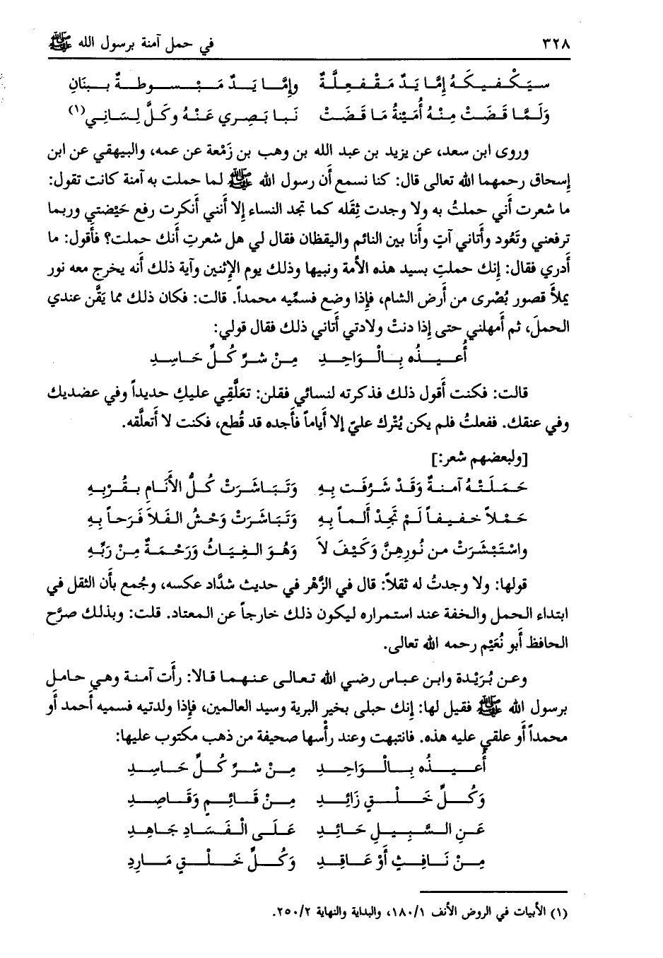 [ (1) ] وروى ابن سعد، عن يزيد بن عبد الله بن وهب بن زمعة عن عمه، والبيهقي عن ابن إسحاق رحمهما الله تعالى قال: كنا نسمع إن رسول الله صلى الله عليه وسلم لما حملت به آمنة كانت تقول: