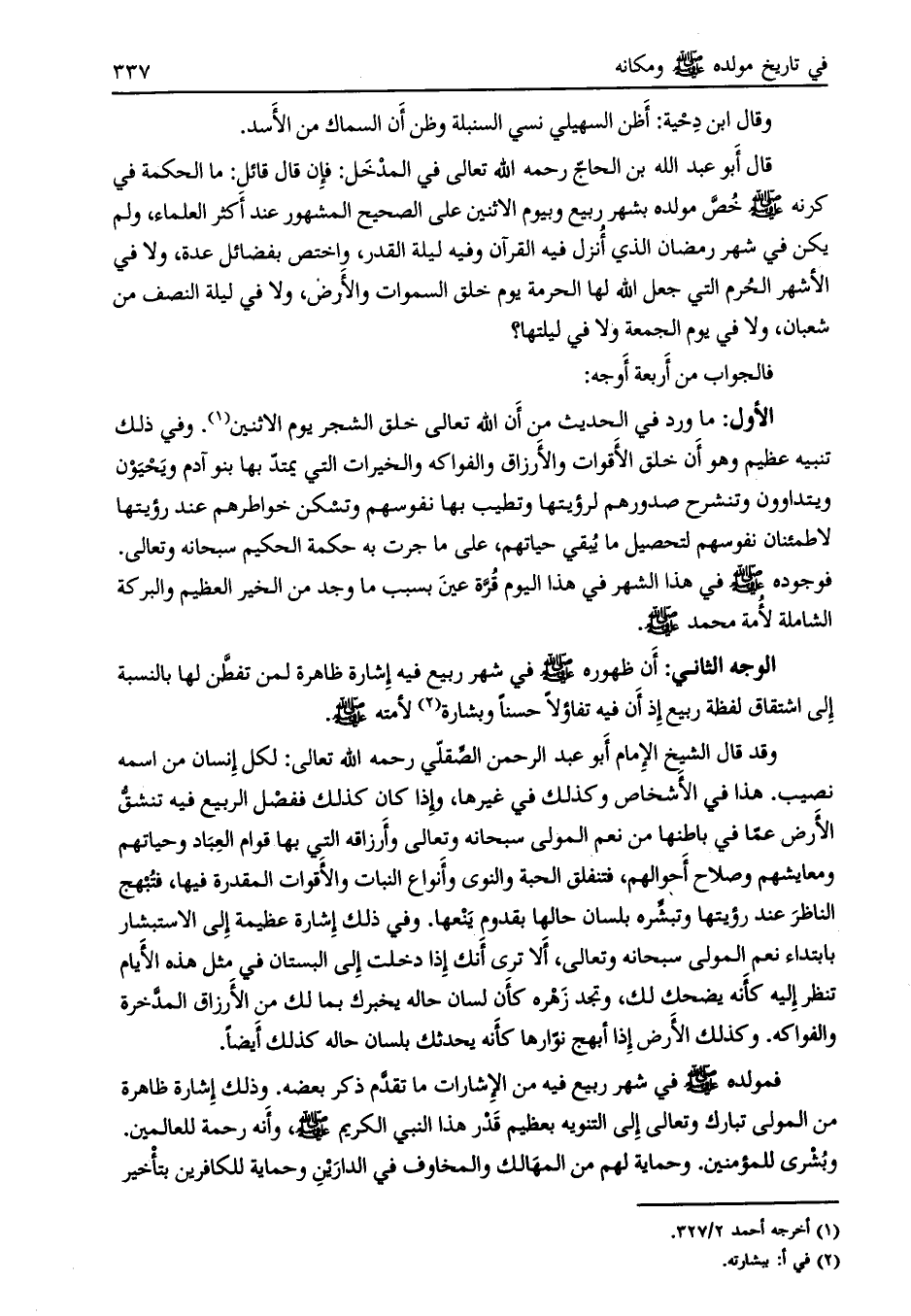 الوجه الثاني: أن ظهوره صلى الله عليه وسلم في شهر ربيع فيه إشارة ظاهرة لمن تفطّن لها بالنسبة إلى اشتقاق لفظة ربيع إذ أن فيه تفاؤلاً حسناً وبشارة [ (2) ] لأمته صلى الله عليه وسلّم.