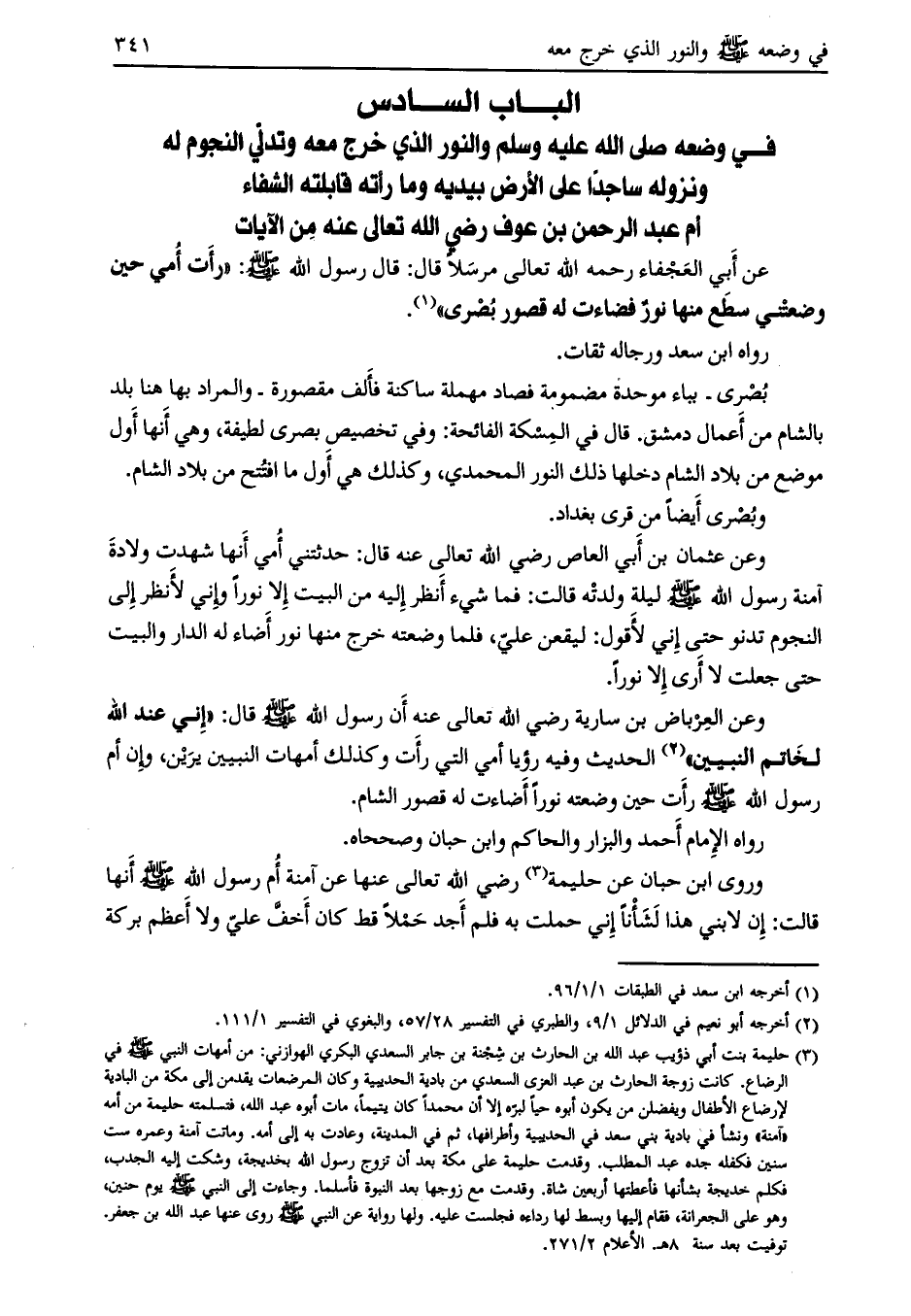 وعن العرباض بن سارية رضي الله تعالى عنه إن رسول الله صلى الله عليه وسلم قال: «إني عند الله لخاتم النبيين» [ (2) ] الحديث وفيه رؤيا أمي التي رأت وكذلك أمهات النبيين يرين، وإن أم رسول الله صلى الله عليه وسلم رأت حين وضعته نوراً أضاءت له قصور الشام.