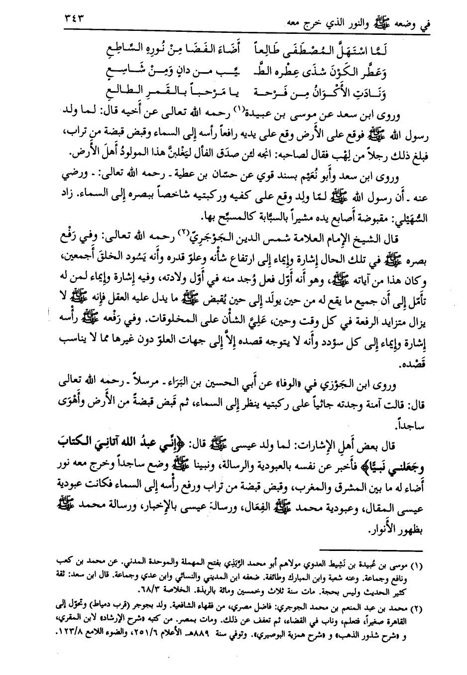 قال الشيخ الإمام العلامة شمس الدين الجوجريّ [ (2) ] رحمه الله تعالى: وفي رفع بصره صلى الله عليه وسلم في تلك الحال إشارة وإيماء إلى ارتفاع شأنه وعلوّ قدره وأنه يسود الخلق أجمعين، وكان هذا من آياته صلى الله عليه وسلم، وهو أنه أول فعل وجد منه في أوّل ولادته، وفيه إشارة وإيماء لمن له تأمّل إلى إن جميع ما يقع له من حين يولد إلى حين يقبض صلى الله عليه وسلّم ما يدل عليه العقل فإنه صلى الله عليه وسلم لا يزال متزايد الرفعة في كل وقت وحين، عليّ الشأن على المخلوقات. وفي رفعه صلى الله عليه وسلم رأسه إشارة وإيماء إلى كل سؤدد وأنه لا يتوجه قصده إلاّ إلى جهات العلوّ دون غيرها مما لا يناسب قصده.