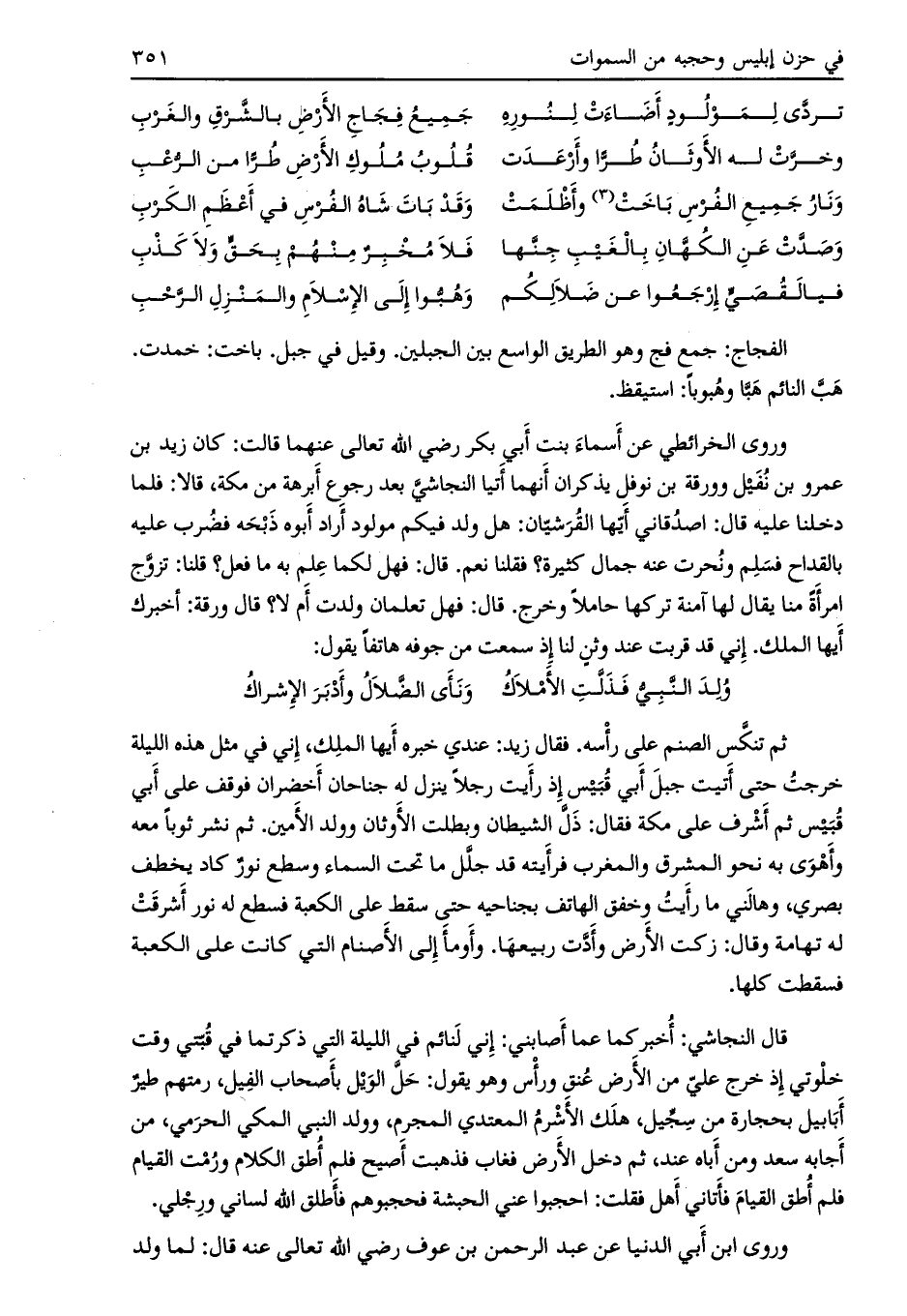 قال النجاشي: أخبركما عما أصابني: إني لنائم في الليلة التي ذكرتما في قبّتي وقت خلوتي إذ خرج عليّ من الأرض عنق ورأس وهو يقول: حلّ الويل بأصحاب الفيل، رمتهم طيرٌ أبابيل بحجارة من سجّيل، هلك الأشرم المعتدي المجرم، وولد النبي المكي الحرمي، من أجابه سعد ومن أباه عند، ثم دخل الأرض فغاب فذهبت أصيح فلم أطق الكلام ورمت القيام فلم أطق القيام فأتاني أهل فقلت: احجبوا عني الحبشة فحجبوهم فأطلق الله لساني ورجلي.