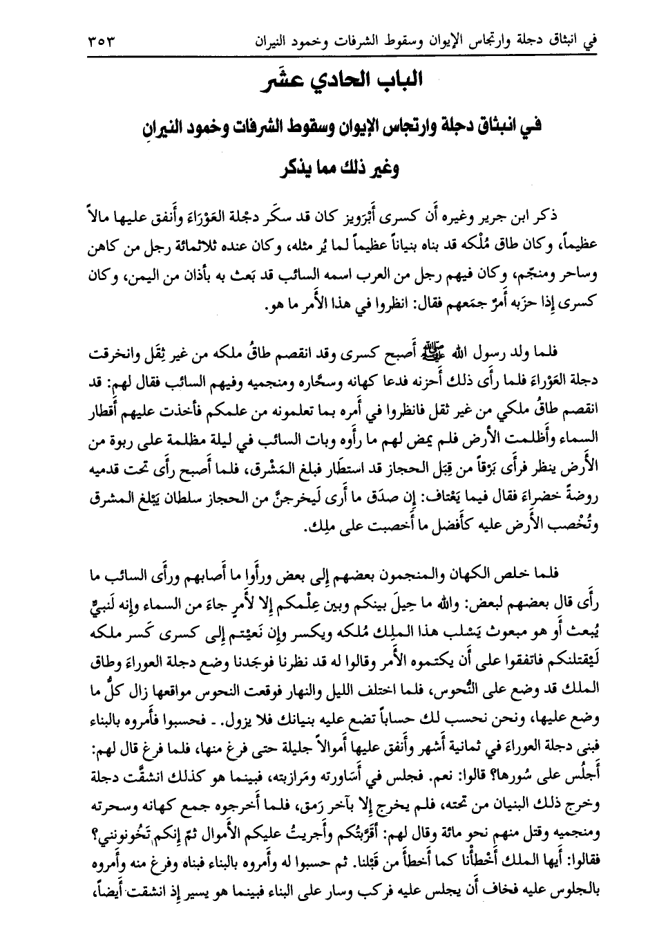 الباب الحادي عشر في انبثاق دجلة وارتجاس الإيوان وسقوط الشرفات وخمود النيران وغير ذلك مما يذكر