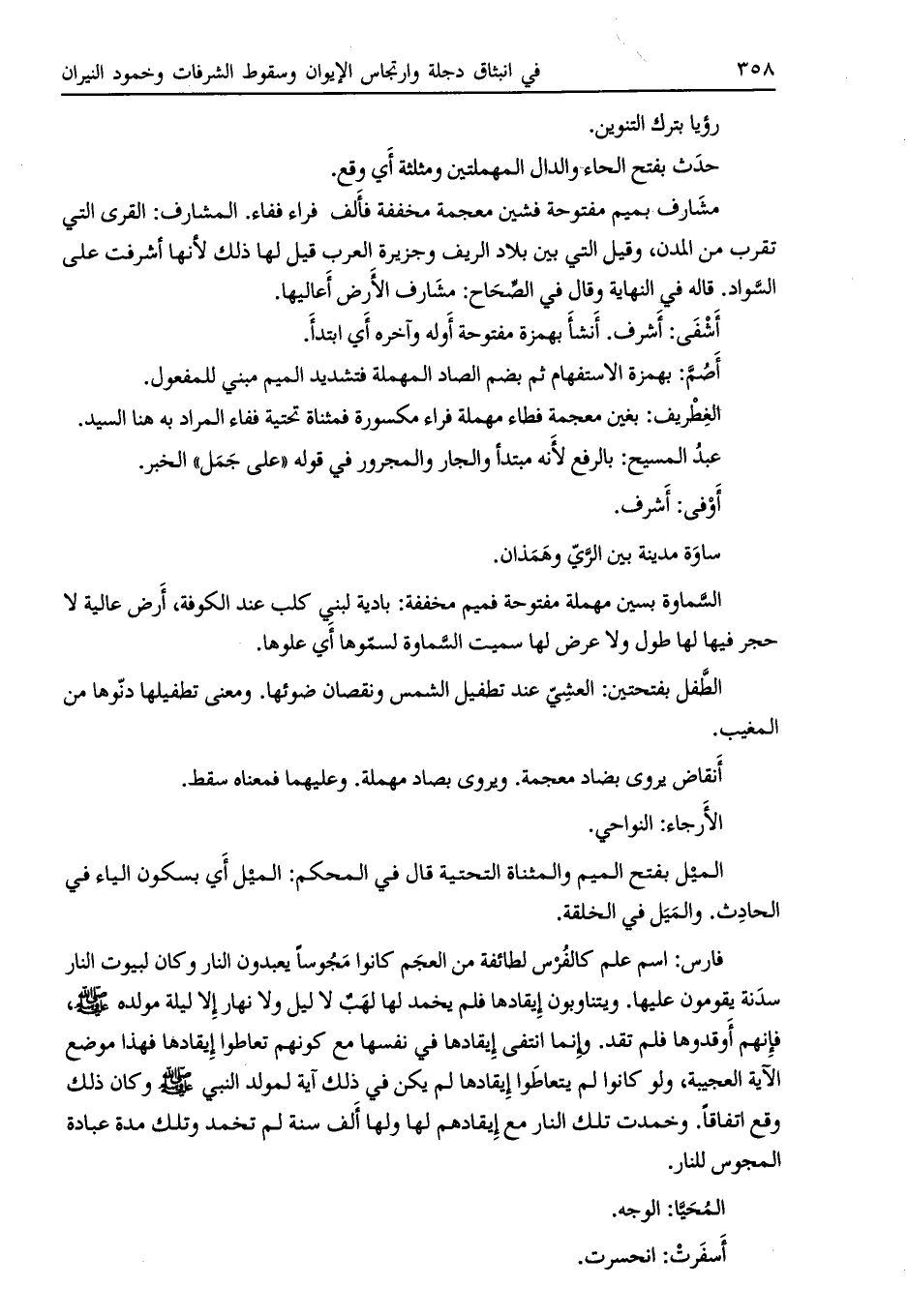 فارس: اسم علم كالفرس لطائفة من العجم كانوا مجوساً يعبدون النار وكان لبيوت النار سدنة يقومون عليها. ويتناوبون إيقادها فلم يخمد لها لهبٌ لا ليل ولا نهار إلا ليلة مولده صلى الله عليه وسلم، فإنهم أوقدوها فلم تقد. وإنما انتفى إيقادها في نفسها مع كونهم تعاطوا إيقادها فهذا موضع الآية العجيبة، ولو كانوا لم يتعاطوا إيقادها لم يكن في ذلك آية لمولد النبي صلى الله عليه وسلم وكان ذلك وقع اتفاقاً. وخمدت تلك النار مع إيقادهم لها ولها ألف سنة لم تخمد وتلك مدة عبادة المجوس للنار.