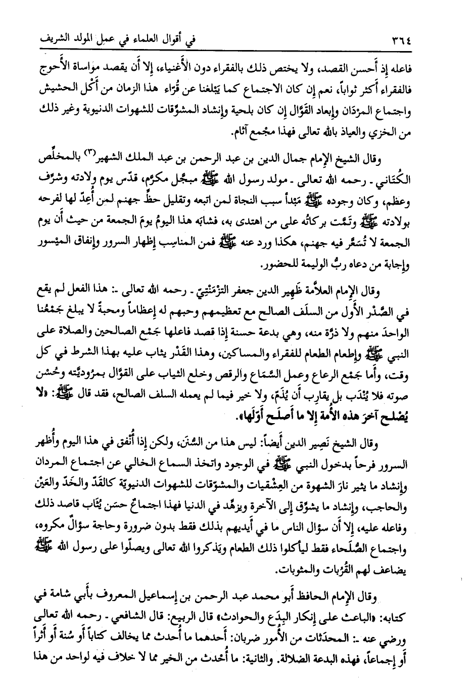 وقال الشيخ الإمام جمال الدين بن عبد الرحمن بن عبد الملك الشهير (3) بالمخلّص الكتاني- رحمه الله تعالى- مولد رسول الله صلى الله عليه وسلم مبجّل مكرّم، قدّس يوم ولادته وشرّف وعظم، وكان وجوده صلى الله عليه وسلم مبدأ سبب النجاة لمن اتبعه وتقليل حظّ جهنم لمن أعدّ لها لفرحه بولادته صلى الله عليه وسلم وتمّت بركاته على من اهتدى به، فشابه هذا اليوم يوم الجمعة من حيث أن يوم الجمعة لا تسعّر فيه جهنم، هكذا ورد عنه صلى الله عليه وسلم فمن المناسب إظهار السرور وإنفاق الميسور وإجابة من دعاه ربّ الوليمة للحضور.