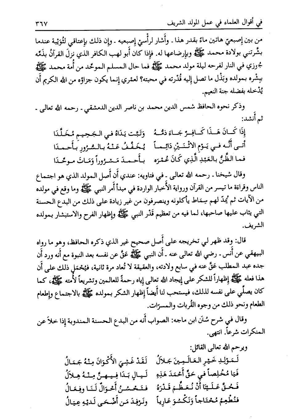 من بين إصبعيّ هاتين ماءً بقدر هذا- وأشار لرأسي إصبعيه- وإن ذلك بإعتاقي لثويبة عند ما بشّرتني بولادة محمد صلى الله عليه وسلم وبإرضاعها له. فإذا كان أبو لهب الكافر الذي نزل القرآن بذمّه جوزي في النار لفرحه ليلة مولد محمد صلى الله عليه وسلّم فما حال المسلم الموحّد من أمة محمد صلّى الله عليه وسلم ببشره بمولده وبذل ما تصل إليه قدرته في محبته؟ لعمري إنما يكون جزاؤه من الله الكريم أن يدخله بفضله جنة النعيم.