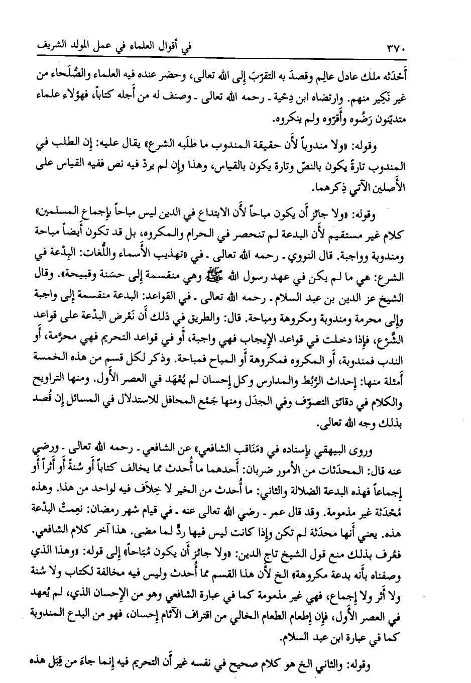 فعرف بذلك منع قول الشيخ تاج الدين: «ولا جائز أن يكون مباحاً» إلى قوله: «وهذا الذي وصفناه بأنه بدعة مكروهة» الخ لأن هذا القسم مما أحدث وليس فيه مخالفة لكتاب ولا سنة ولا أثر ولا إجماع، فهي غير مذمومة كما في عبارة الشافعي وهو من الإحسان الذي، لم يعهد في العصر الأول، فإن إطعام الطعام الخالي من اقتراف الآثام إحسان، فهو من البدع المندوبة كما في عبارة ابن عبد السلام.