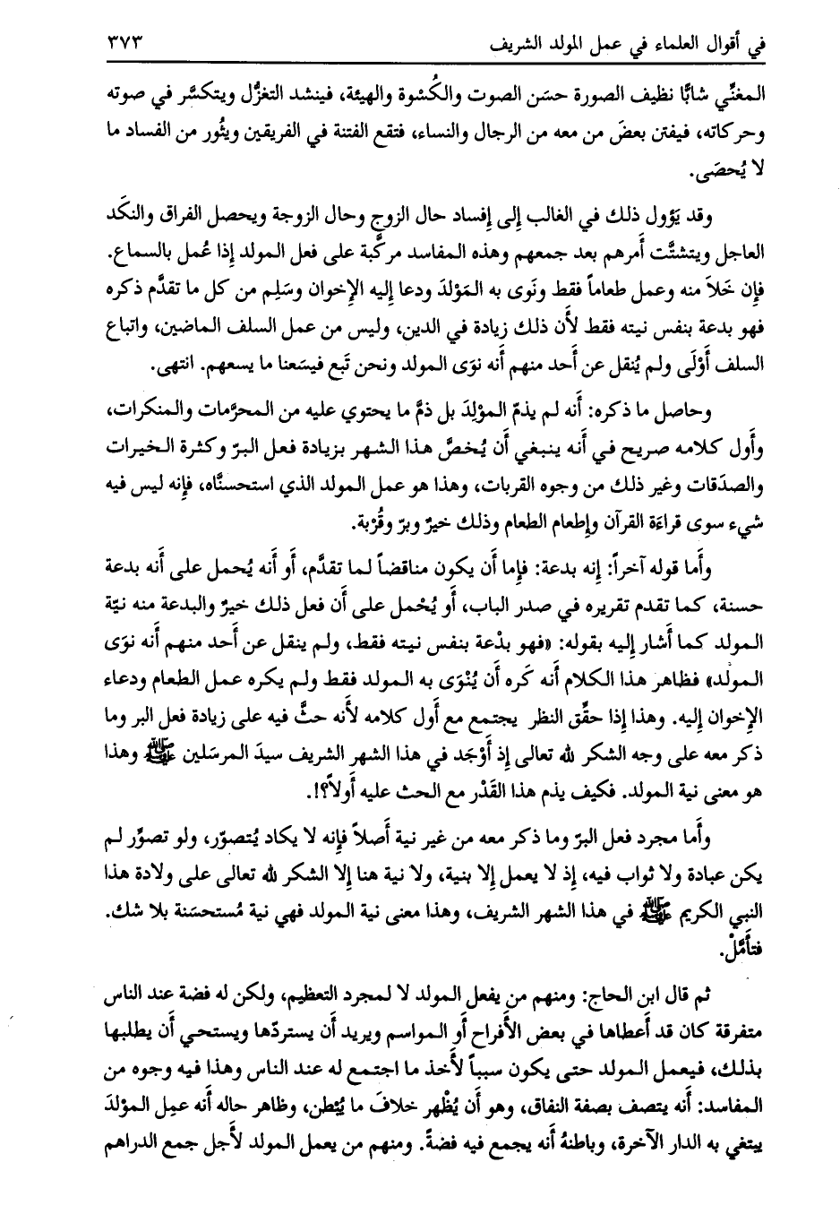 وأما قوله آخراً: إنه بدعة: فإما أن يكون مناقضاًَ لما تقدّم، أو أنه يحمل على أنه بدعة حسنة، كما تقدم تقريره في صدر الباب، أو يحمل على أن فعل ذلك خير والبدعة منه نيّة المولد كما أشار إليه بقوله: «فهو بدعة بنفس نيته فقط، ولم ينقل عن أحد منهم أنه نوى المولد» فظاهر هذا الكلام أنه كره أن ينوي به المولد فقط ولم يكره عمل الطعام ودعاء الإخوان إليه. وهذا إذا حقّق النظر يجتمع مع أول كلامه لأنه حثّ فيه على زيادة فعل البر وما ذكر معه على وجه الشكر لله تعالى إذ أوجد في هذا الشهر الشريف سيد المرسلين صلى الله عليه وسلم وهذا هو معنى نية المولد. فكيف يذم هذا القدر مع الحث عليه أولاً؟!.