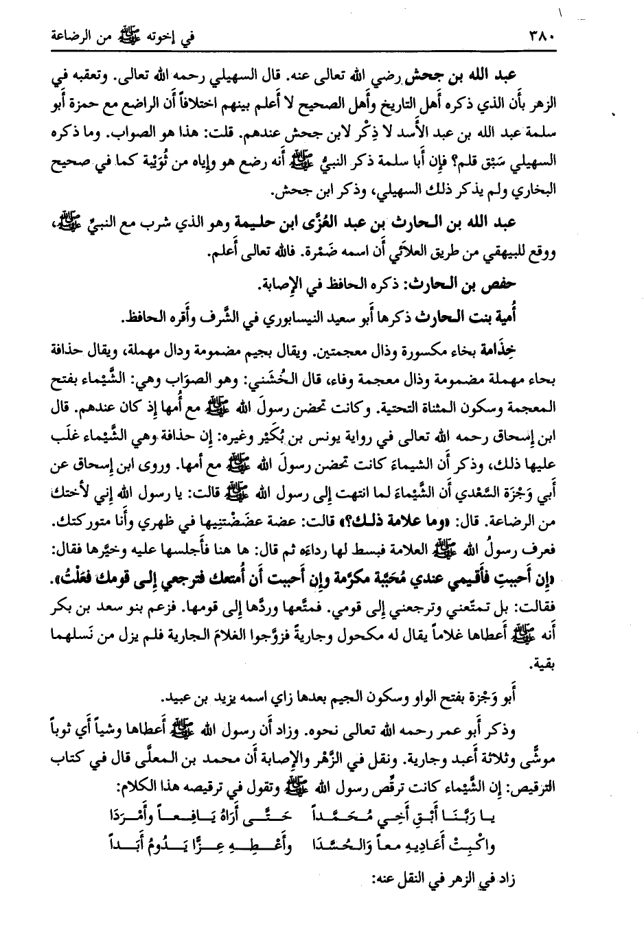 وروى ابن إسحاق عن أبي وجزة السّعدي أن الشّيماء لما انتهت إلى رسول الله صلى الله عليه وسلم قالت: يا رسول الله إني لأختك من الرضاعة. قال: «وما علامة ذلك؟» قالت: عضة عضضتنيها في ظهري وأنا متوركتك.
