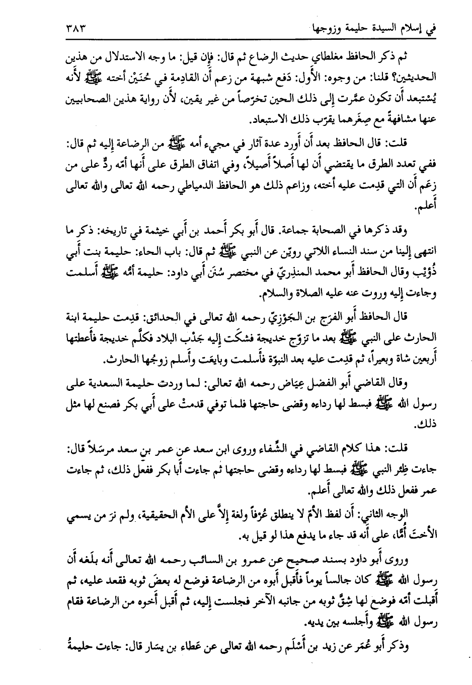 ثم ذكر الحافظ مغلطاي حديث الرضاع ثم قال: فإن قيل: ما وجه الاستدلال من هذين الحديثين؟ قلنا: من وجوه: الأول: دفع شبهة من زعم أن القادمة في حنين أخته صلى الله عليه وسلم لأنه يستبعد أن تكون عمّرت إلى ذلك الحين تخرّصاً من غير يقين، لأن رواية هذين الصحابيين عنها مشافهةً مع صغرهما يقرّب ذلك الاستبعاد.