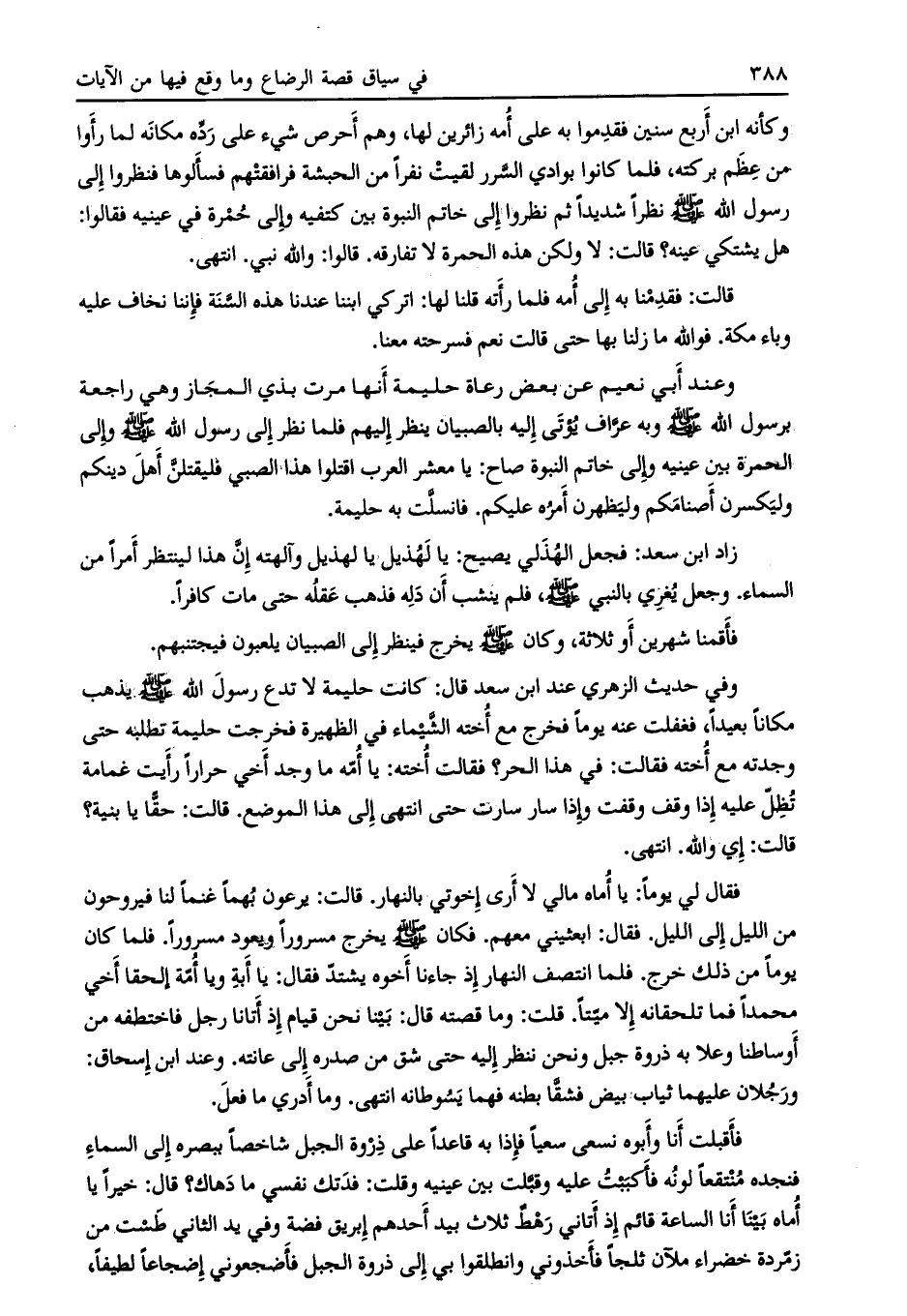 وفي حديث الزهري عند ابن سعد قال: كانت حليمة لا تدع رسول الله صلى الله عليه وسلم يذهب مكاناً بعيداً، فغفلت عنه يوما فخرج مع أخته الشّيماء في الظهيرة فخرجت حليمة تطلبه حتى وجدته مع أخته فقالت: في هذا الحر؟ فقالت أخته: يا أمّه ما وجد أخي حراراً رأيت غمامة تظلّ عليه إذا وقف وقفت وإذا سار سارت حتى انتهى إلي هذا الموضع. قالت: حقّاً يا بنية؟
